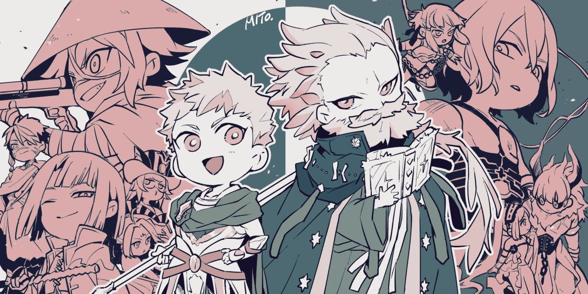 ahoge ajirogasa artist_name asterios_(fate) beard book cape chibi cloak euryale_(fate) facial_hair fate/grand_order fate_(series) grin gun hat horns koyanskaya_(fate) koyanskaya_(foreigner)_(second_ascension)_(fate) limited_palette long_hair mito_ryoi mustache nezha_(fate) one_eye_closed open_book penthesilea_(fate) polearm ptolemy_(fate) ptolemy_(first_ascension)_(fate) rifle scar scar_on_face scar_on_nose smile spear sugitani_zenjubou_(fate) sugitani_zenjubou_(second_ascension)_(fate) taigong_wang_(fate) theseus_(fate) weapon