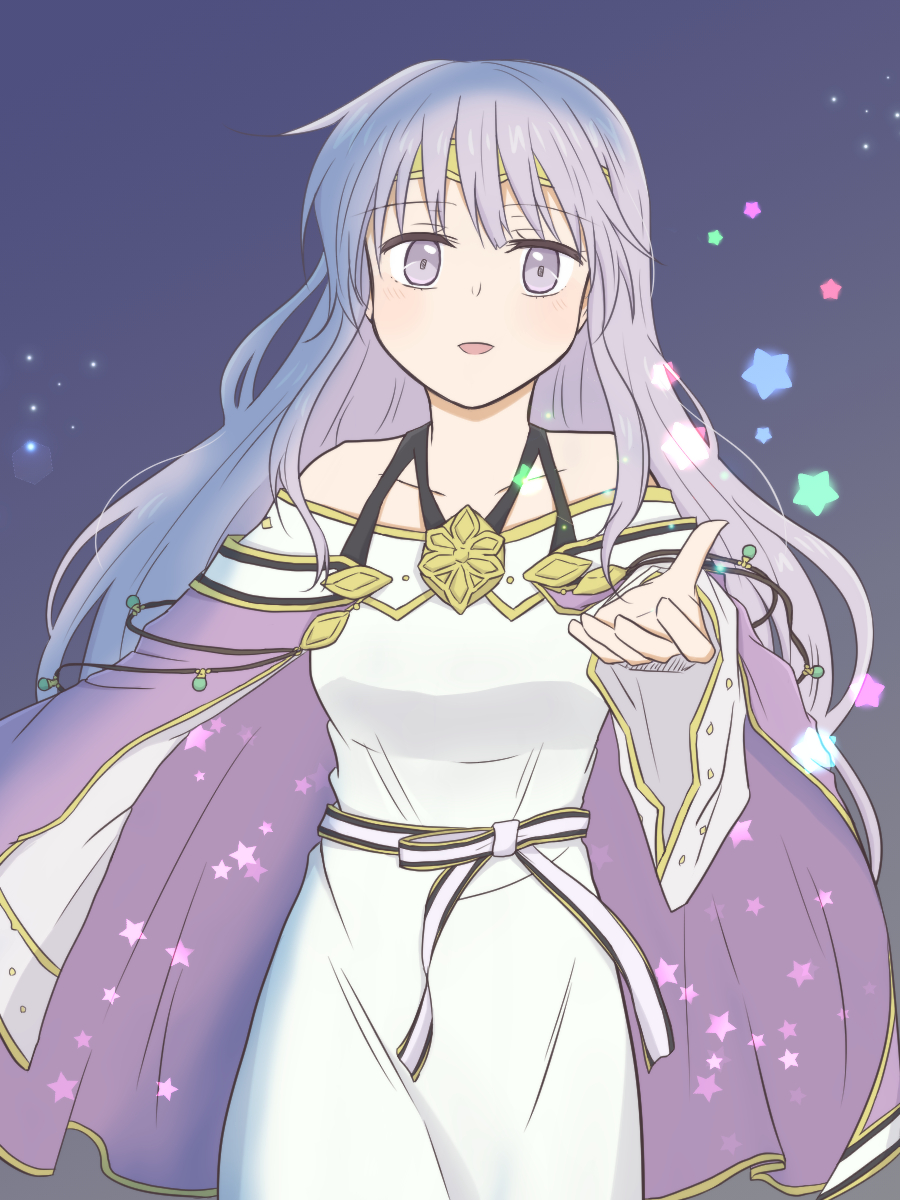 1girl bare_shoulders circlet dress fire_emblem fire_emblem:_genealogy_of_the_holy_war highres julia_(fire_emblem) looking_at_viewer nintendo open_mouth purple_eyes purple_hair reaching reaching_towards_viewer simple_background solo white_dress yoshioriri