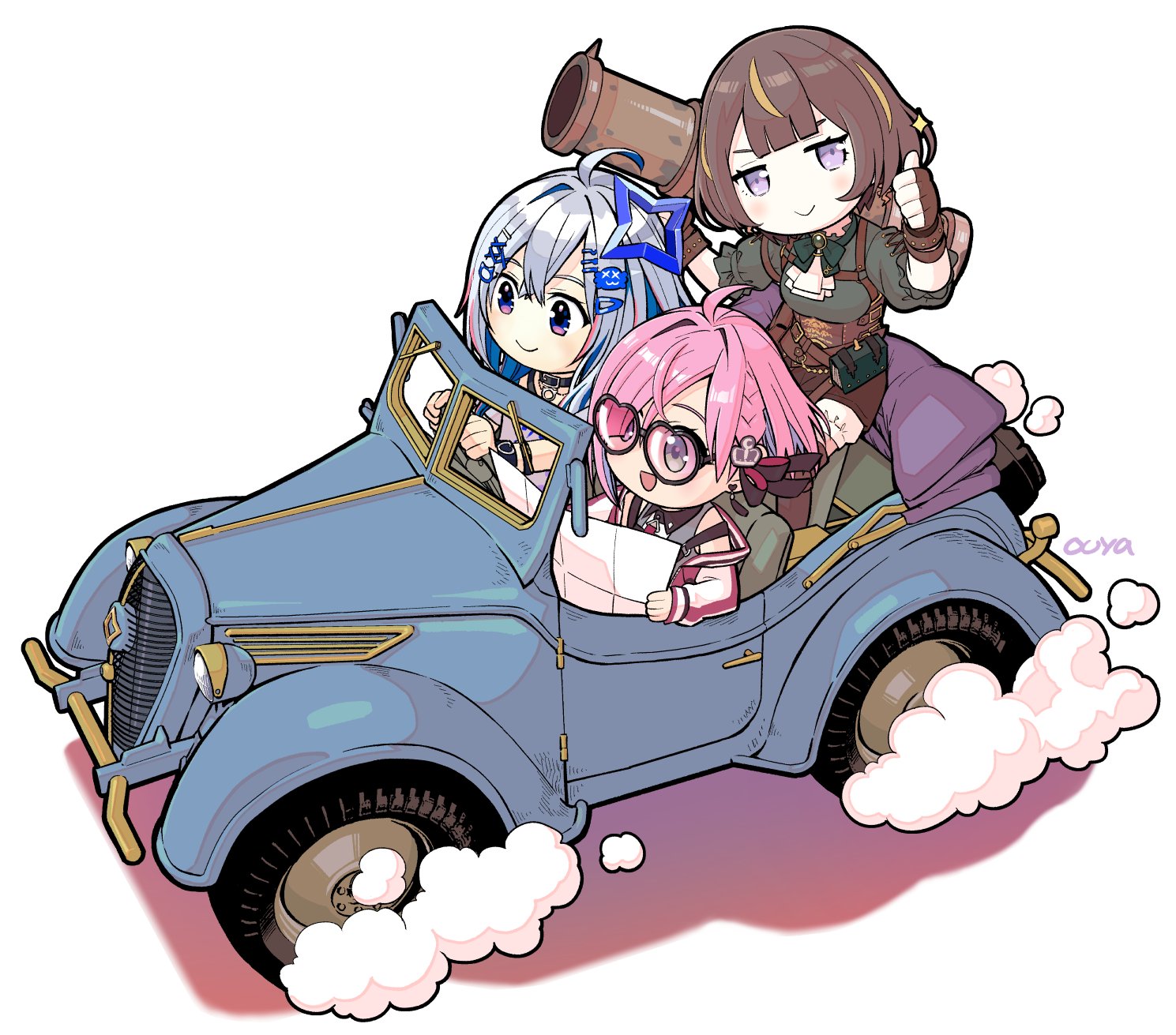 3girls ahoge amane_kanata anya_melfissa blue_car braid brown_hair car chibi convertible crying driving grey_hair heart heart-shaped_eyewear highres himemori_luna holding holding_map hololive hololive_indonesia map motor_vehicle multiple_girls ouya_(maboroshimori) pink_hair purple_eyes rocket_launcher smile streaming_tears sunglasses tears thumbs_up virtual_youtuber weapon