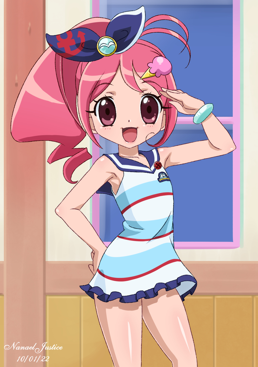 1girl armpits artist_name blue_bow bow dated dress flat_chest food-themed_hair_ornament hair_ornament highres ice_cream_hair_ornament jewelpet_(series) jewelpet_kira_deco! nanaeljustice oomiya_pink open_mouth outdoors pink_eyes pink_hair sanrio side_ponytail smile solo striped_clothes striped_dress thick_thighs thighs