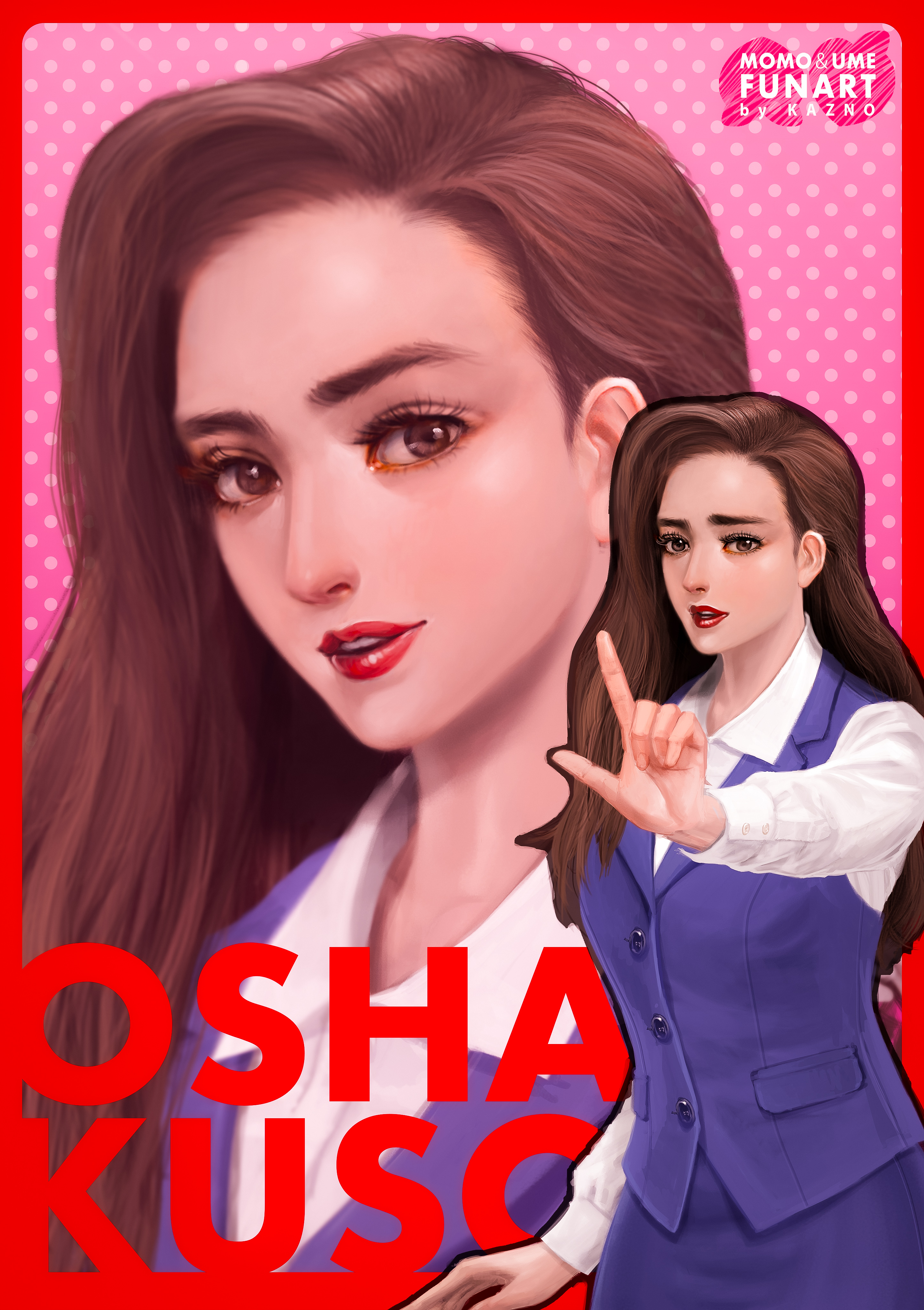 1girl absurdres blue_skirt blue_vest brown_eyes brown_hair character_request collared_shirt highres index_finger_raised momoume office_lady outside_border red_lips sengoku_gallery shirt simple_background skirt solo vest