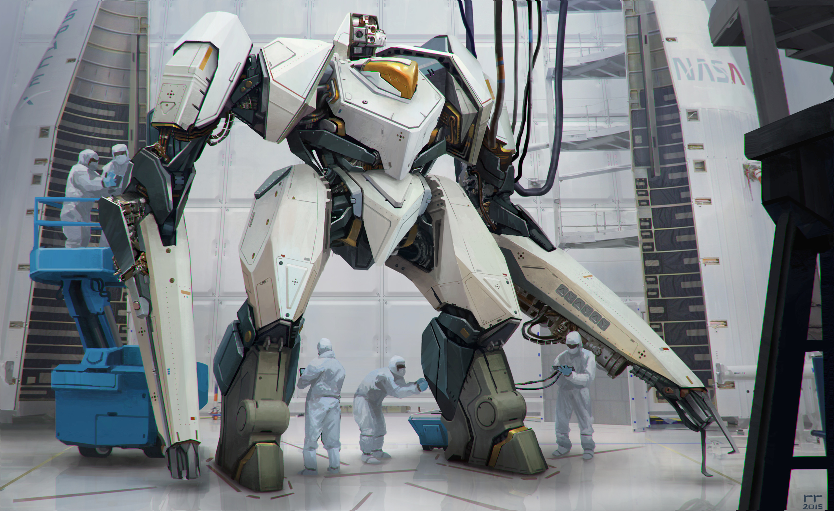 5boys absurdres cable commentary engineer english_commentary hangar hat highres machinery mask mecha mecha_focus mouth_mask multiple_boys nasa original realistic redesign repairing robot robots_r4 rocket science_fiction scientist signature spacex uniform