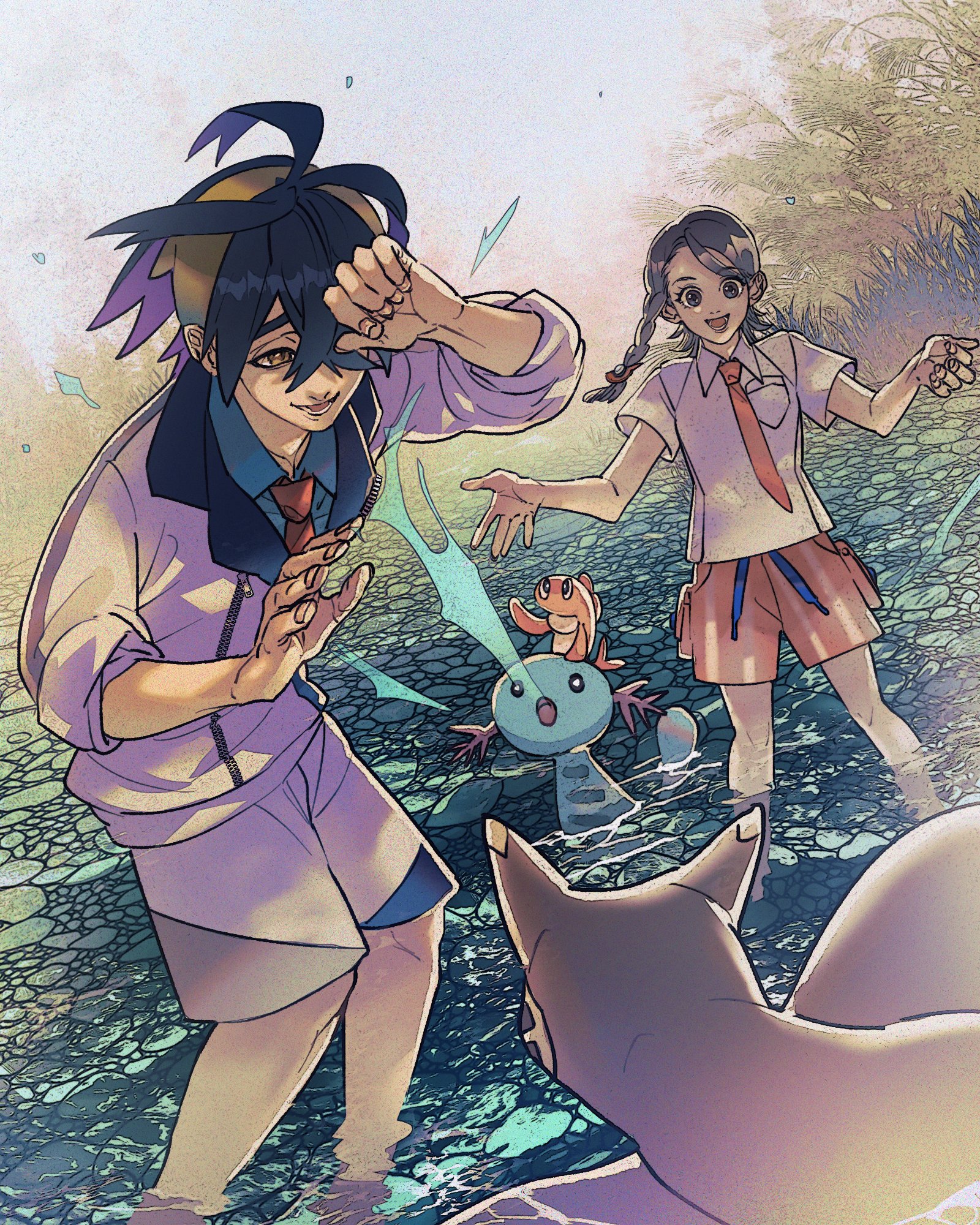 1boy 1girl black_hair blue_shirt braid brown_eyes brown_hair collared_shirt crossed_bangs furret gen_2_pokemon hair_between_eyes hairband highres jacket juliana_(pokemon) kieran_(pokemon) long_sleeves multicolored_hair naranja_academy_school_uniform necktie nintendo open_mouth orange_necktie orange_shorts pokemon pokemon_(creature) pokemon_scarlet_and_violet purple_hair red_necktie school_uniform shirt short_hair short_sleeves shorts sleeves_rolled_up smile splashing stb81370884 tatsugiri tatsugiri_(curly) two-tone_hair wading white_jacket wooper yellow_eyes yellow_hairband