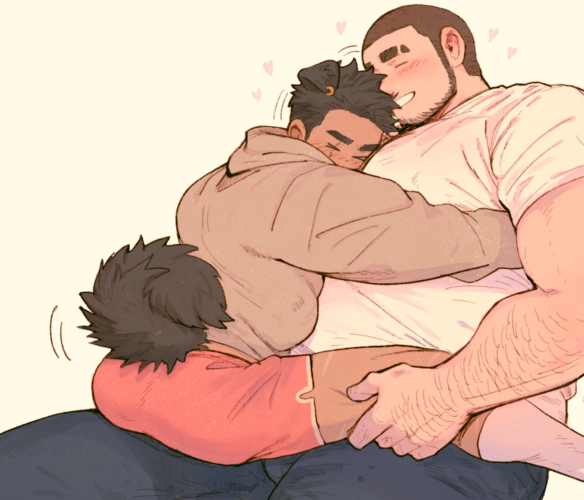2boys animal_ears arm_hair bara beard big_belly black_hair blush brown_hair chinstrap_beard couple dark-skinned_male dark_skin denim dog_boy dog_ears ear_wiggle earrings eyebrow_cut face_to_pecs facial_hair highres hug inuyama_masato_(shan) jeans jewelry kumano_daigo_(shan) large_pectorals male_focus multiple_boys muscular muscular_male original pants pectorals shan_(shanshankuo) shirt short_hair shorts sideburns single_earring size_difference smile socks straddling sweater tail tail_wagging thick_eyebrows thick_thighs thighs very_short_hair white_shirt yaoi