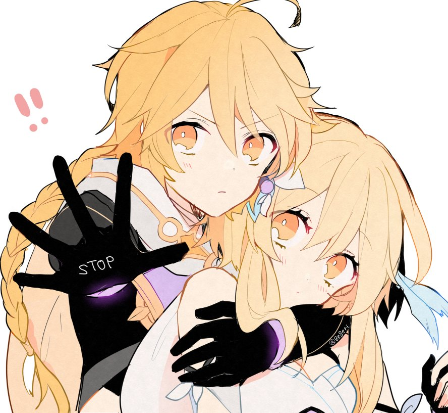 ! !! 1boy 1girl aether_(genshin_impact) ahoge black_gloves blonde_hair blush braid brother_and_sister closed_mouth dress genshin_impact gloves hug hug_from_behind looking_at_viewer lumine_(genshin_impact) open_hand orange_eyes scarf short_hair_with_long_locks siblings twins upper_body white_background white_dress white_scarf yae_(yae_ringo)