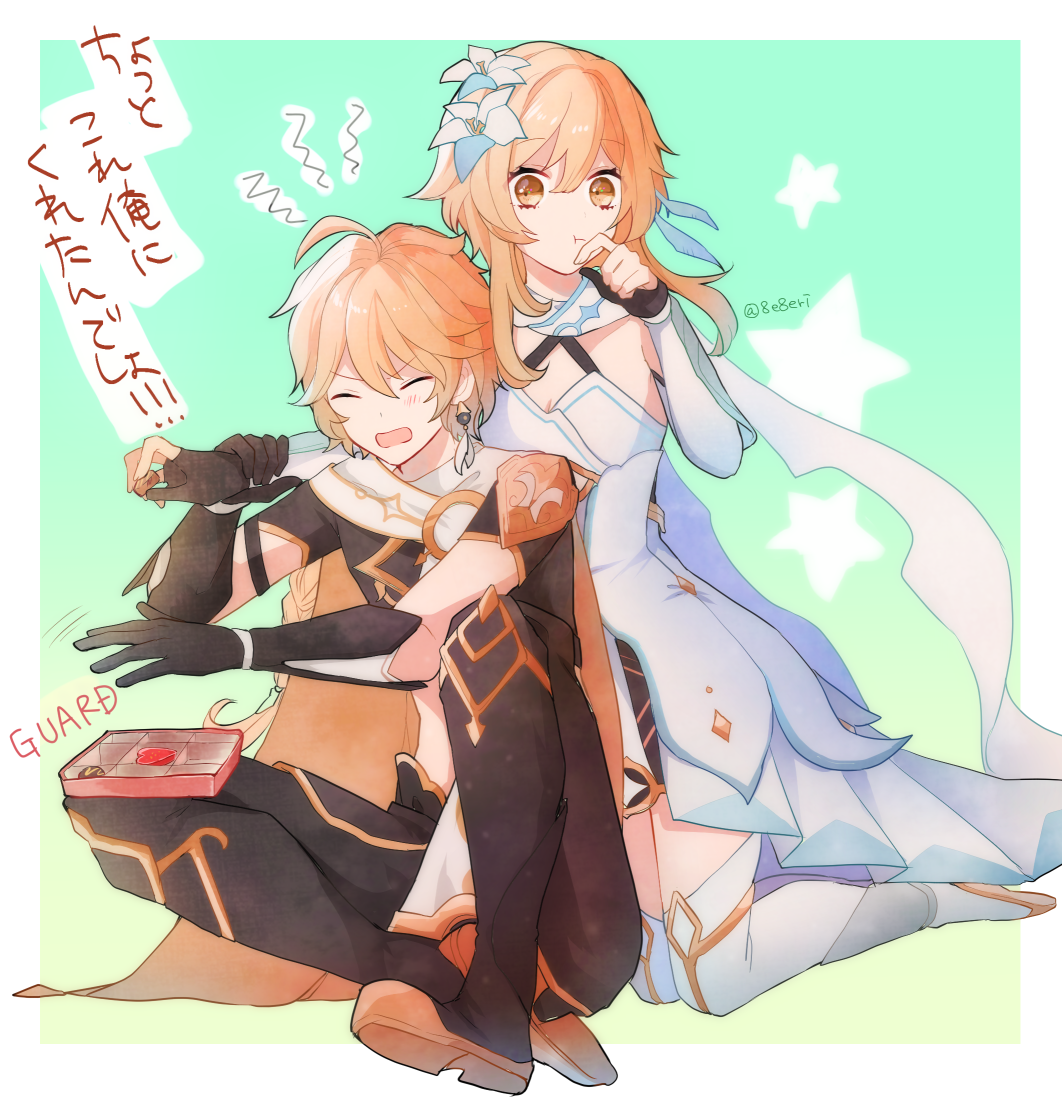 1boy 1girl :t aether_(genshin_impact) annoyed bento black_gloves black_pants black_shirt border brother_and_sister closed_eyes closed_mouth commentary_request dress genshin_impact gloves green_background kneeling lumine_(genshin_impact) pants scarf shirt siblings thighhighs translation_request twins twitter_username white_border white_dress white_scarf white_thighhighs yae_(yae_ringo)
