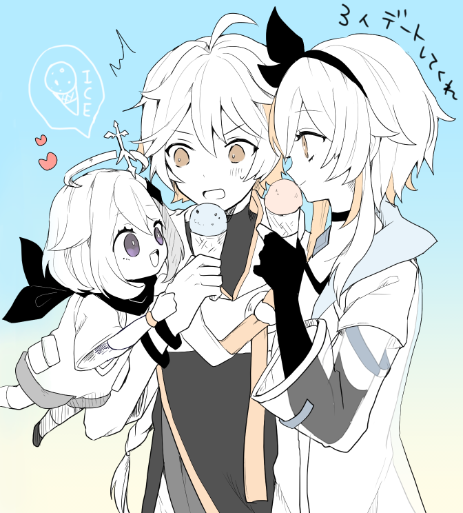 1boy 2girls aether_(genshin_impact) blue_background brother_and_sister brown_eyes choker commentary_request fingerless_gloves food genshin_impact gloves hairband holding holding_food ice_cream ice_cream_cone jacket limited_palette lumine_(genshin_impact) multiple_girls paimon_(genshin_impact) scarf siblings spoken_food twins yae_(yae_ringo)