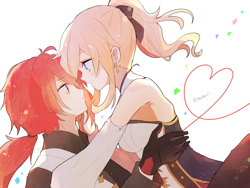 1boy 1girl black_gloves black_ribbon black_shirt blonde_hair blue_eyes closed_mouth collared_shirt detached_collar diluc_(genshin_impact) from_side genshin_impact gloves hair_ribbon heart jean_(genshin_impact) looking_at_another medium_hair ponytail red_eyes red_gloves red_hair ribbon shirt simple_background sleeveless sleeveless_shirt twitter_username two-tone_gloves upper_body vest white_background white_shirt white_vest yae_(yae_ringo)
