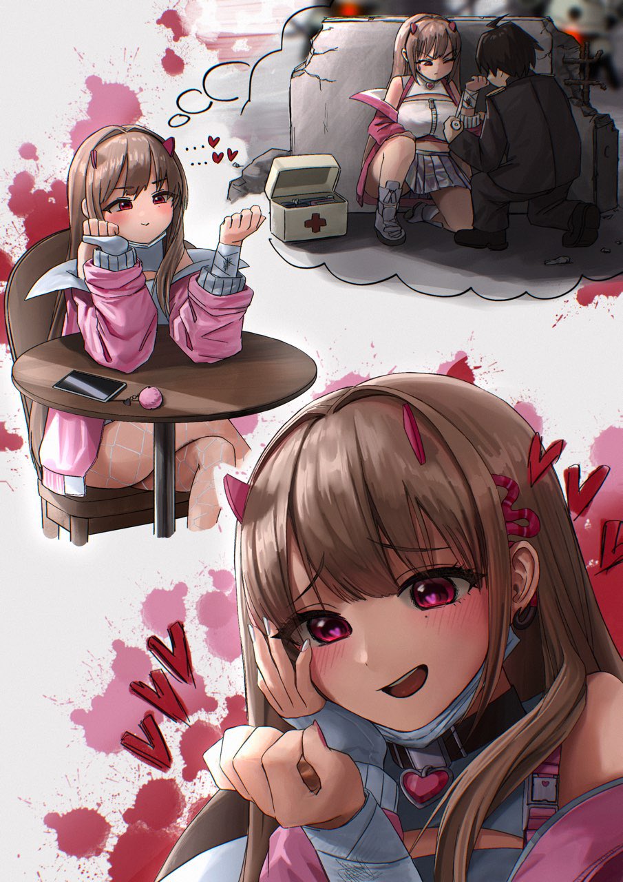 1boy 1girl :d black_collar blush collar commander_(nikke) earrings fishnet_pantyhose fishnets goddess_of_victory:_nikke hair_intakes heart heart-shaped_pupils heart_collar highres horns imagining jacket jewelry light_brown_hair long_hair mask mask_pull mole mole_under_eye mouth_mask nail_polish o_o_k_i_n_a one_eye_closed open_mouth pantyhose pink_horns pink_jacket red_eyes sidelocks single_earring smile speech_bubble symbol-shaped_pupils thinking thought_bubble viper_(nikke) white_nails