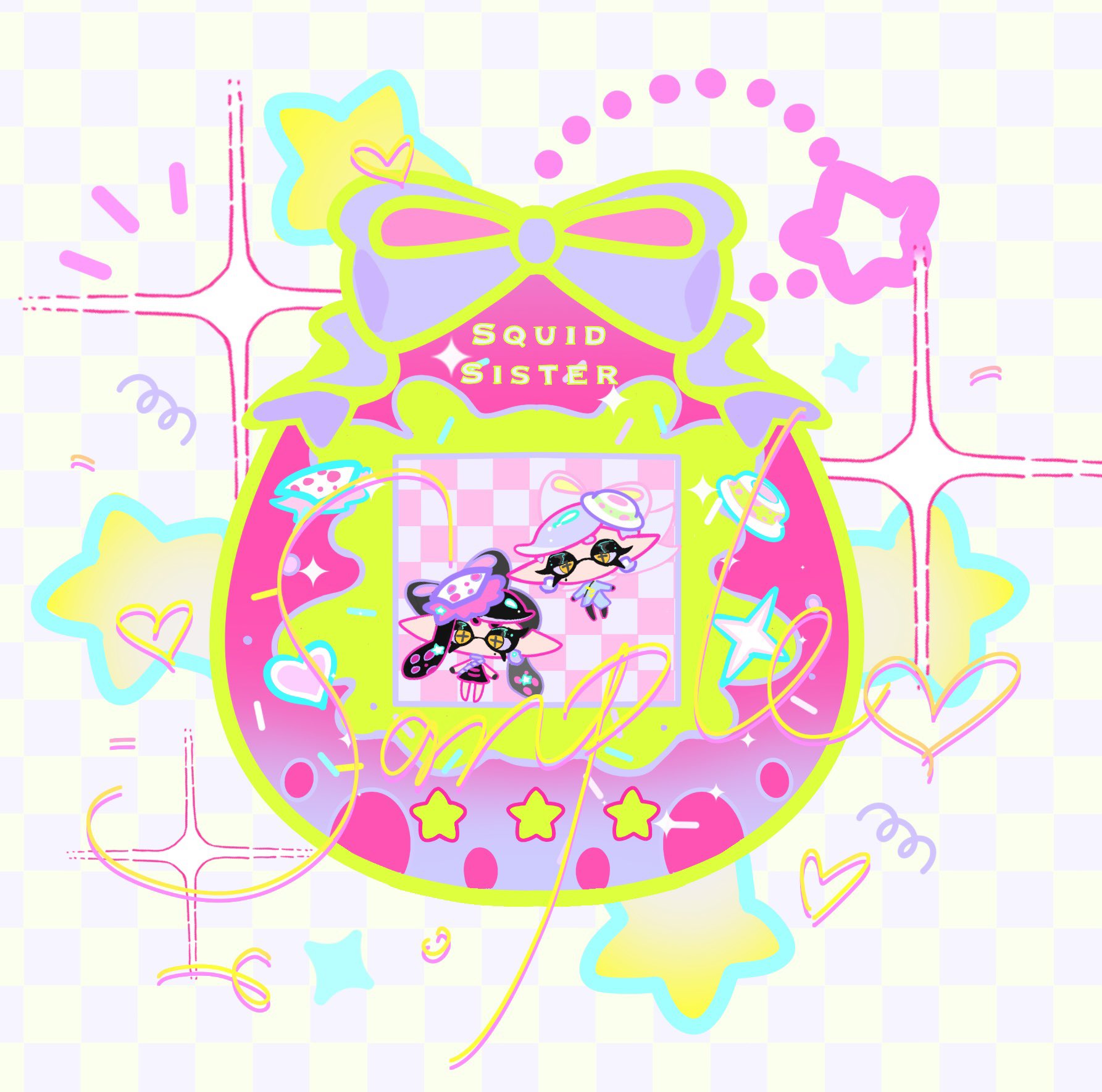 2girls bag barefoot black_dress black_gloves black_hair black_pantyhose blue_outline bow bow-shaped_hair callie_(alterna)_(splatoon) callie_(splatoon) cephalopod_eyes checkered_background chibi chinese_commentary commentary_request cup_on_head dress eyelashes food food-themed_hair_ornament gloves green_outline grey_hair grey_kimono hair_ornament half-closed_eyes heart highres in_bag in_container inkling japanese_clothes kimono long_hair long_sleeves low_twintails marie_(alterna)_(splatoon) marie_(splatoon) mole mole_under_eye multiple_girls nintendo no_mouth notice_lines outline pantyhose pointy_ears purple_background purple_bow purple_scarf sample_watermark scarf short_dress short_hair siblings sisters sleeveless sleeveless_dress sparkle splatoon_(series) star_(symbol) star_hair_ornament striped_clothes striped_dress sushi tamagotchi tamagotchi_(virtual_pet) tentacle_hair twintails two-tone_background virtual_pet_(toy) watermark xiaoyunatie yellow_background yellow_eyes