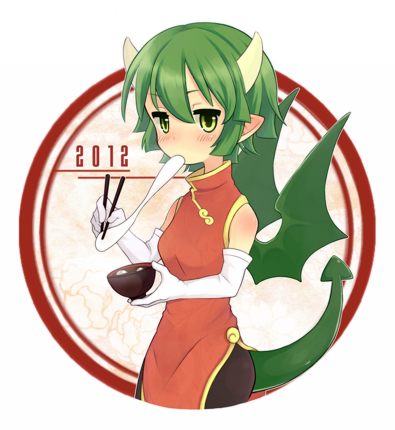 1girl 2012 black_pantyhose blush bowl china_dress chinese_clothes chopsticks dot_nose draco_centauros dragon_girl dragon_horns dragon_tail dragon_wings dress eating elbow_gloves food gloves green_eyes green_wings holding holding_bowl holding_chopsticks horns jitome looking_at_viewer lr. madou_monogatari noodles pantyhose pointy_ears puyopuyo red_dress short_hair simple_background solo tail udon white_background white_gloves wings