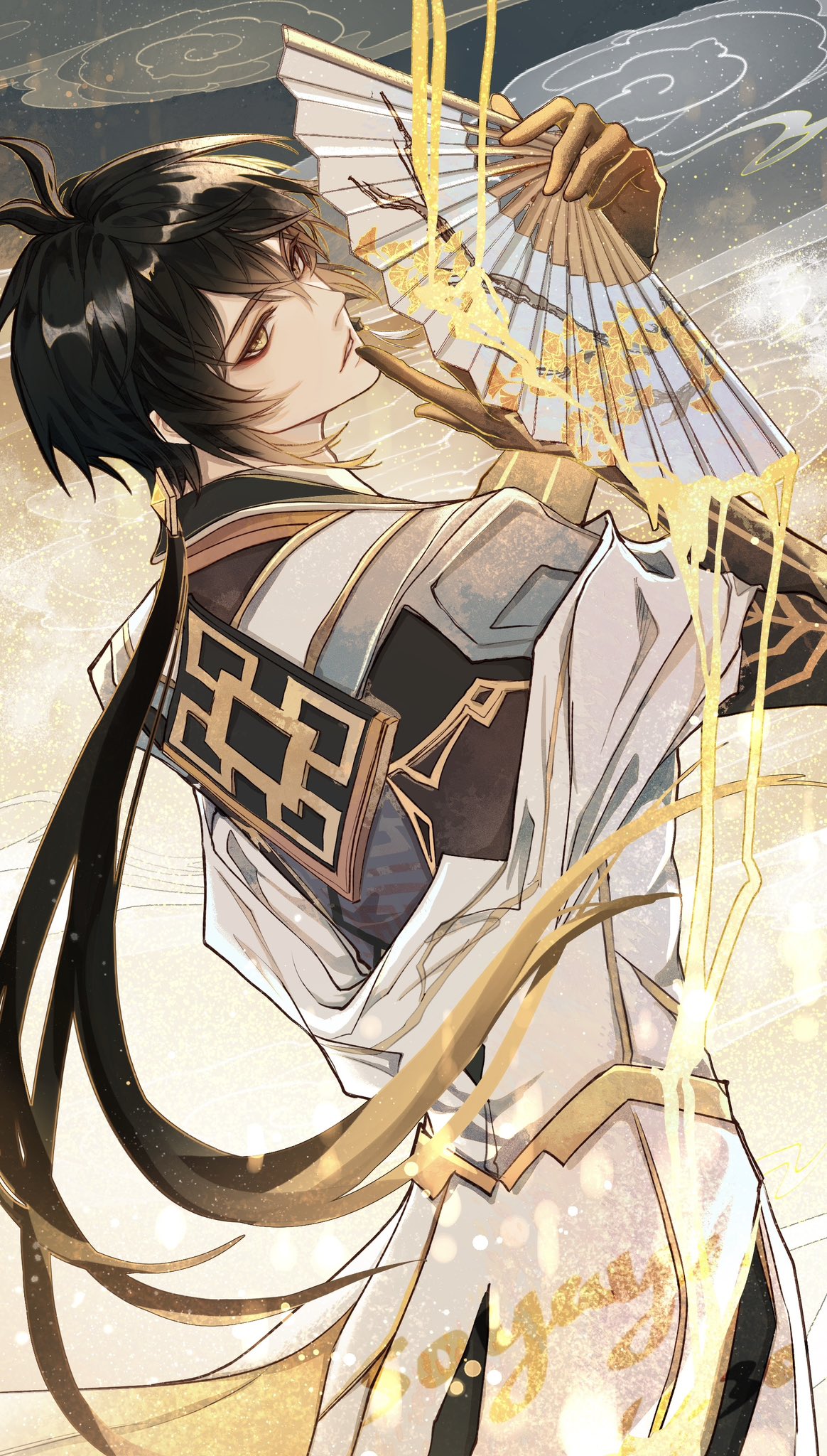1boy antenna_hair back black_hair black_jacket black_pants blonde_hair cape chrysos_milk cloud crystal_hair_ornament earrings eyeshadow folded_fan folding_fan from_behind genshin_impact gradient_hair hair_between_eyes hair_ornament hand_fan hands_up highres holding holding_fan jacket jewelry long_hair long_sleeves looking_at_viewer looking_back low_ponytail makeup male_focus multicolored_hair open_mouth pants ponytail red_eyeshadow single_earring smile solo standing tassel tassel_earrings white_cape yellow_eyes zhongli_(genshin_impact)