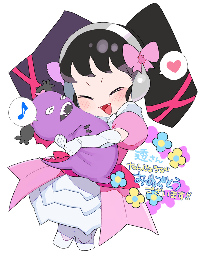 1girl :d ^_^ black_hair blue_flower blush bow closed_eyes commentary_request cropped_legs dress elbow_gloves facing_another fangs flower gajira_(pripara) gaaruru_(pripara) gloves hair_bow happy_birthday headphones heart hug long_hair moudoku_(decopon3rd) musical_note open_mouth pink_bow pink_dress pretty_series pripara puffy_short_sleeves puffy_sleeves short_sleeves smile spoken_heart spoken_musical_note twintails white_gloves yellow_flower