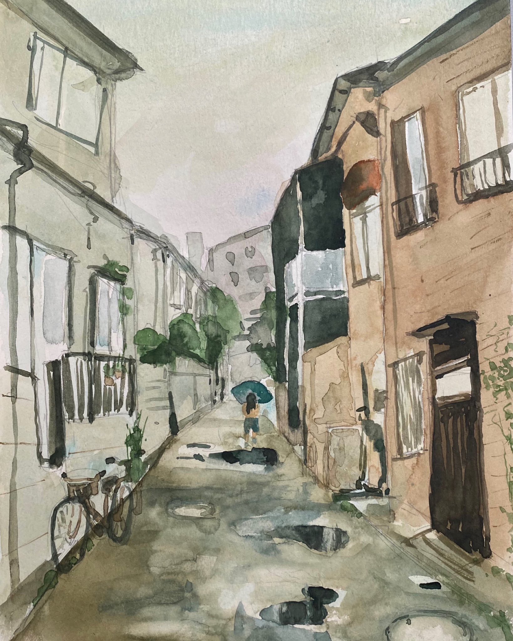 1girl bicycle building bush cloud cloudy_sky door from_behind grey_sky highres holding holding_umbrella muted_color original outdoors painting_(medium) path plant puddle rain road sakaue111 sky solo traditional_media tree umbrella vanishing_point watercolor_(medium) window