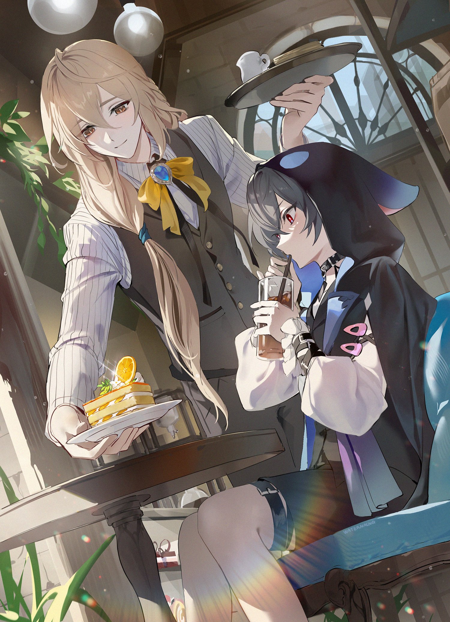 0jae 2boys black_choker black_cloak black_shirt black_shorts blonde_hair brown_eyes butler cake cake_slice choker cloak drinking food fruit grey_hair grey_vest highres holding holding_plate holding_tray hood hood_up long_hair long_sleeves low_ponytail male_focus multiple_boys orange_(fruit) original plate ponytail red_eyes ribbon shirt short_hair shorts tray vest white_shirt yellow_ribbon
