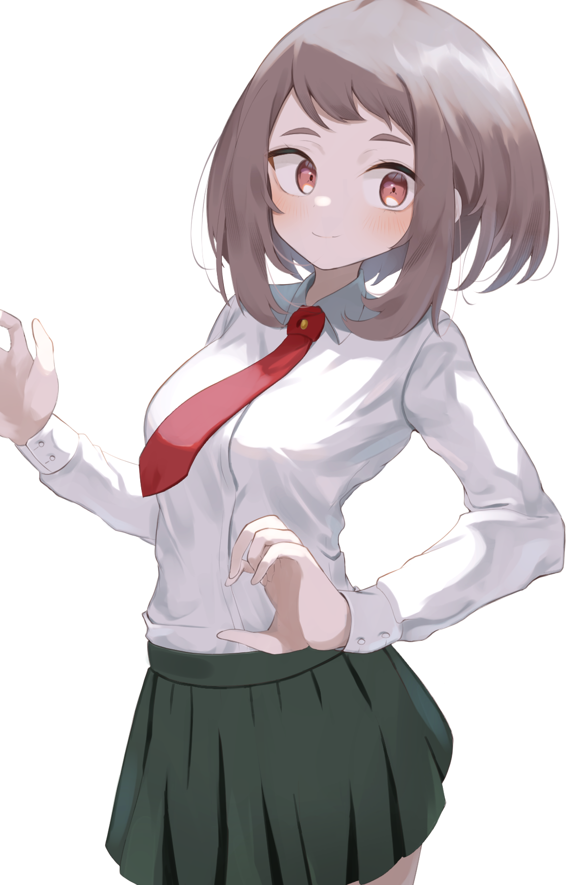 1girl boku_no_hero_academia brown_eyes brown_hair closed_mouth green_skirt highres necktie red_necktie shino2121 shirt short_hair simple_background skirt smile solo uniform uraraka_ochako white_background white_shirt
