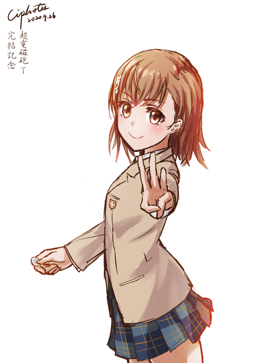 1girl 2020 20s artist_name blush brown_eyes brown_hair ciphotis coin dated female_focus flower hair_flower hair_ornament highres japanese_text looking_at_viewer matching_hair/eyes miniskirt misaka_mikoto school_uniform short_hair skirt smile solo standing thighs toaru_kagaku_no_railgun toaru_majutsu_no_index tokiwadai_school_uniform w white_background winter_uniform