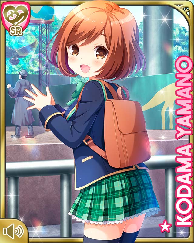 1girl backpack bag blue_jacket bow brown_eyes brown_hair card character_name day girlfriend_(kari) green_bow green_skirt jacket looking_at_viewer official_art open_mouth outdoors plaid_clothes plaid_skirt qp:flapper school_uniform skirt smile socks solo yamano_kodama