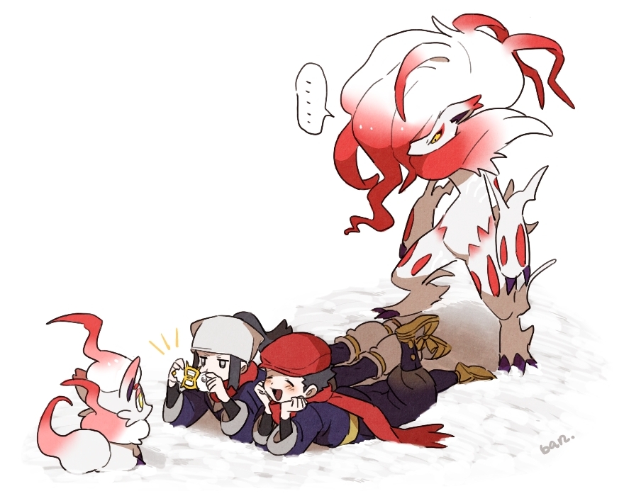 1boy 1girl akari_(pokemon) arc_phone ban_(ban62460424) commentary_request hair_over_one_eye hands_on_own_face hat headscarf hisuian_zoroark hisuian_zorua lying nintendo on_ground on_stomach pokemon pokemon_(creature) pokemon_legends:_arceus red_scarf rei_(pokemon) scarf taking_picture white_headscarf yellow_eyes