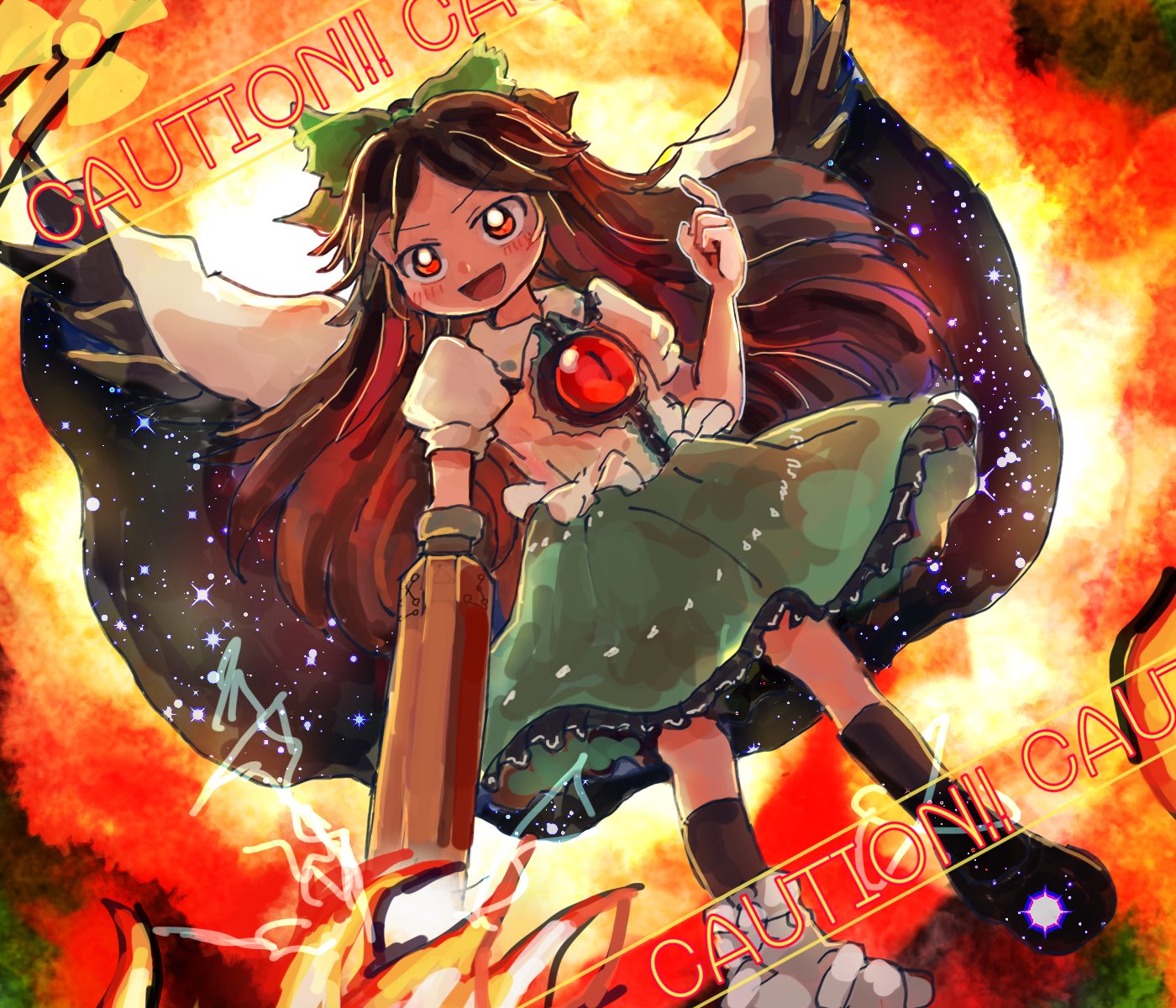 1girl :d arm_cannon asymmetrical_footwear bird_girl bird_wings black_socks black_wings bow bright_pupils brown_hair cape caution commentary_request explosion full_body green_bow green_skirt hair_bow highres long_hair looking_at_viewer mismatched_footwear open_mouth red_eyes reiuji_utsuho rome35793562 short_sleeves skirt smile socks solo chest_eye touhou weapon white_cape white_pupils wings