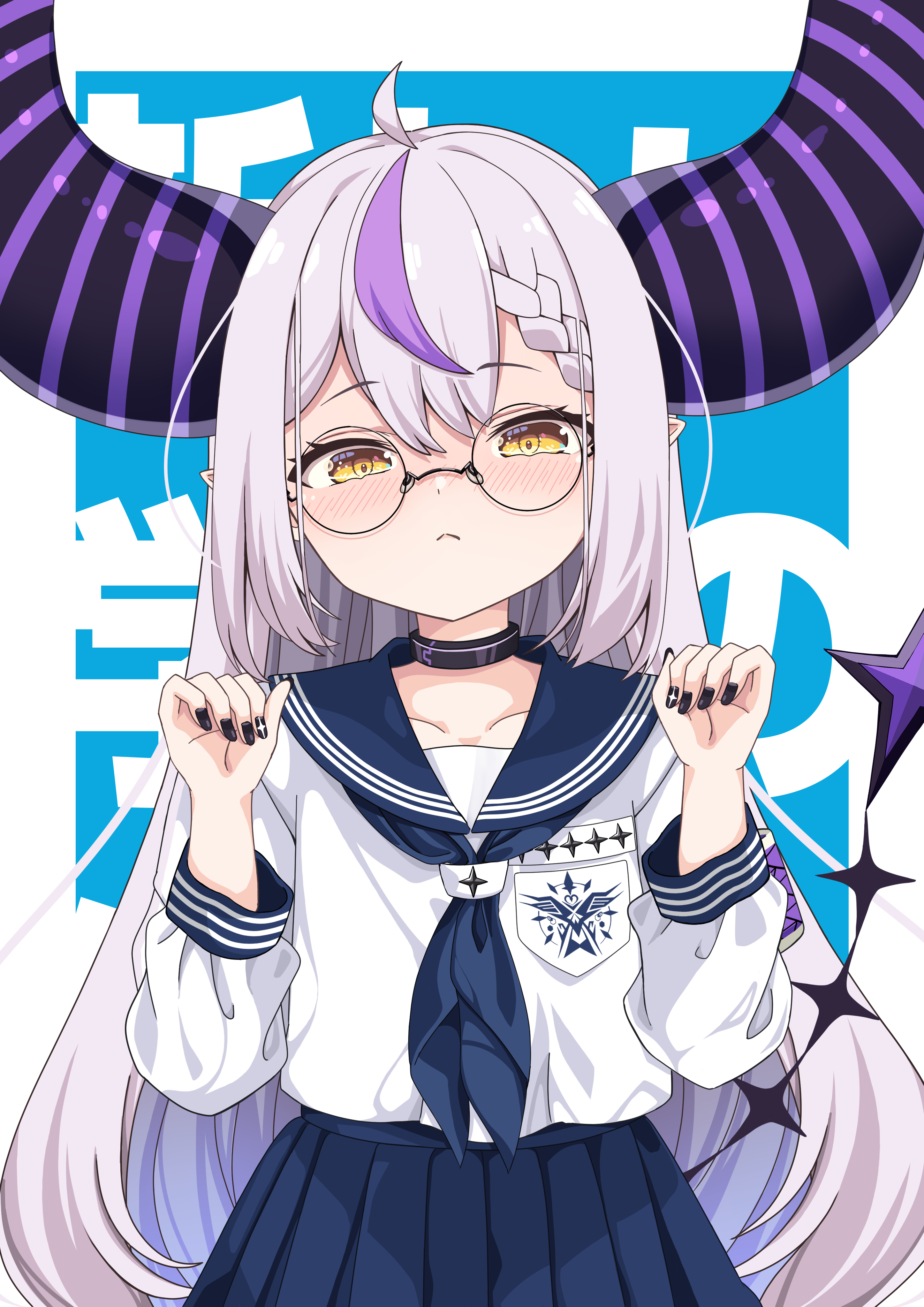 1girl absurdres ahoge black_horns black_nails blue_skirt braid braided_bangs collar grey_hair highres hololive horns kyabetsu_ningen la+_darknesss long_hair multicolored_hair neckerchief pointy_ears purple_hair round_eyewear sailor_collar school_uniform serafuku skirt streaked_hair striped_horns virtual_youtuber yellow_eyes