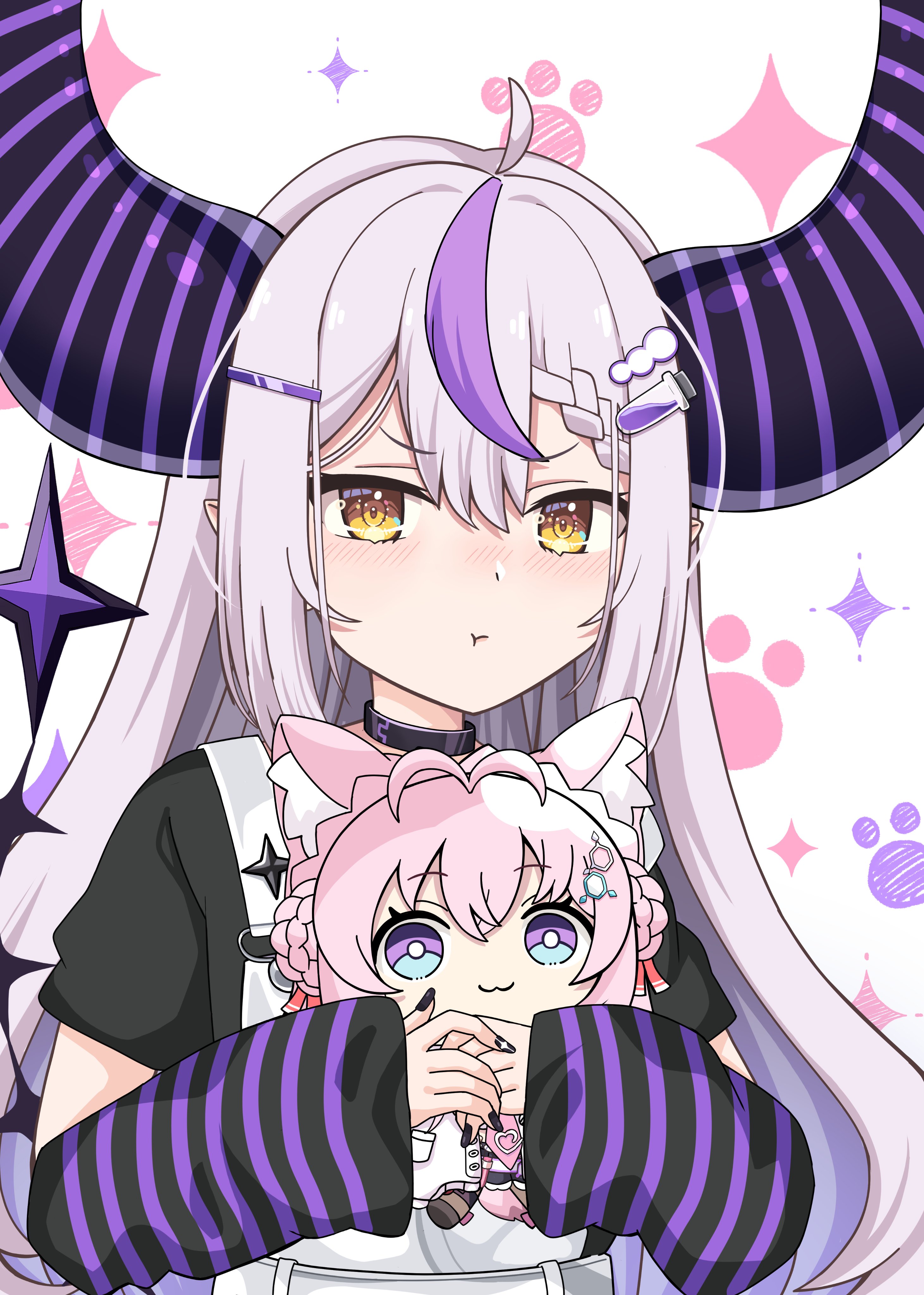 1girl absurdres ahoge black_horns black_nails blush braid braided_bangs character_doll collar doll grey_hair hakui_koyori highres hololive horns kyabetsu_ningen la+_darknesss long_hair looking_at_viewer multicolored_hair nail_polish pointy_ears pout purple_hair solo streaked_hair striped_horns striped_sleeves virtual_youtuber yellow_eyes