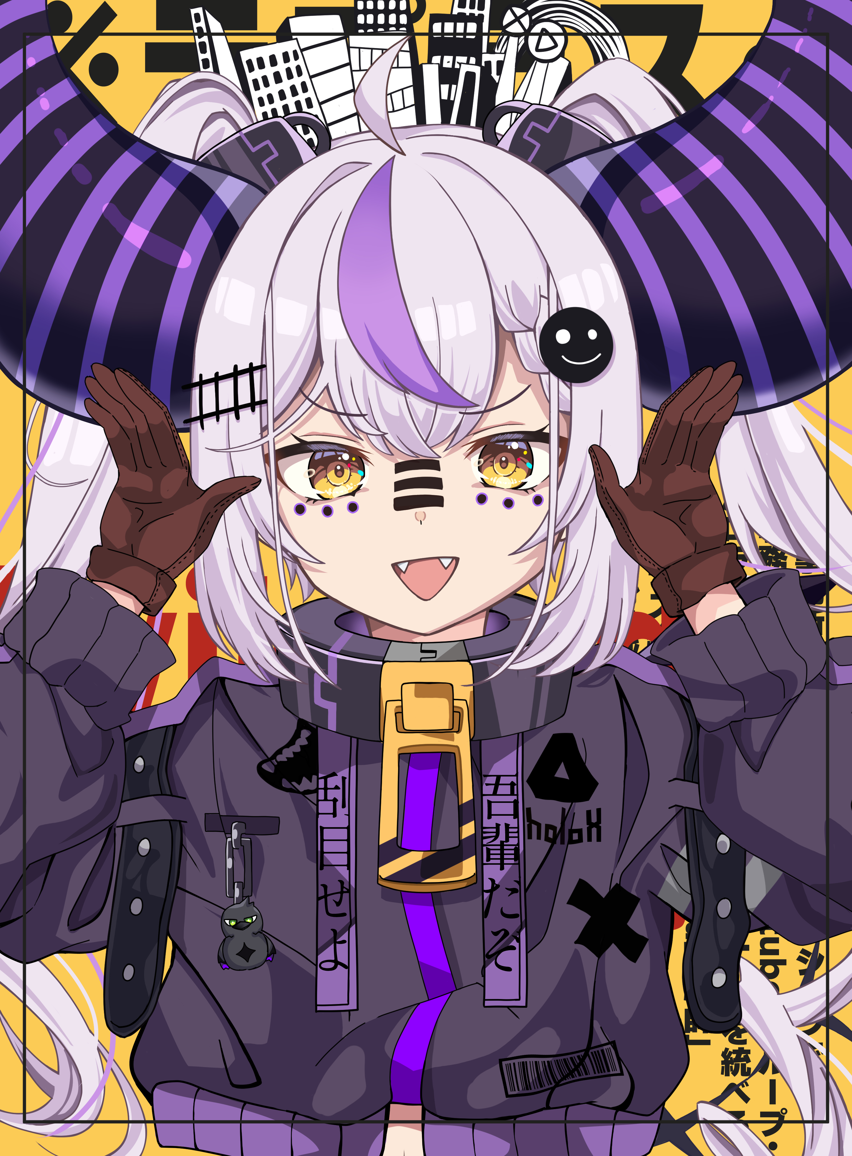 1girl absurdres ahoge black_horns braid braided_bangs collar facial_mark fangs gloves grey_hair hair_ornament highres hololive horns kyabetsu_ningen la+_darknesss long_hair metal_collar multicolored_hair pointy_ears purple_hair streaked_hair striped_horns virtual_youtuber yellow_eyes