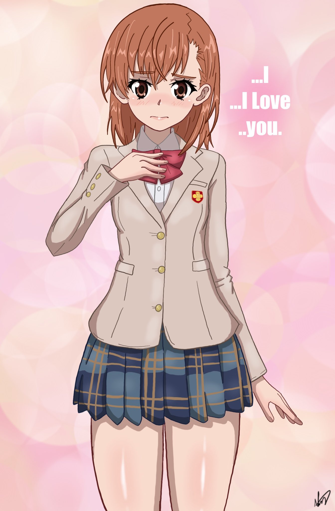1girl 2023 20s blush brown_eyes brown_hair bubble_background confession embarrassed english_text female_focus highres looking_at_viewer matching_hair/eyes miniskirt misaka_mikoto nashdnash2007 school_uniform short_hair signature skirt solo standing thighs toaru_kagaku_no_railgun toaru_majutsu_no_index tokiwadai_school_uniform winter_uniform