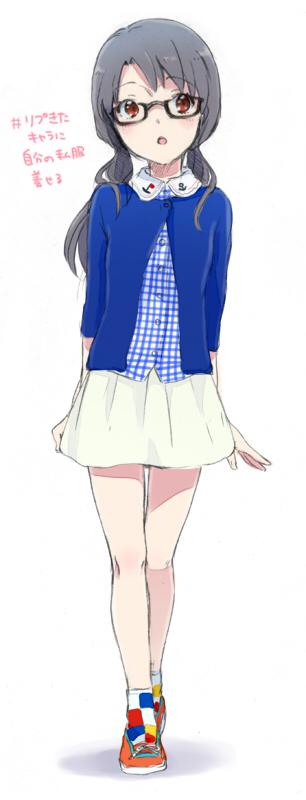 1girl anchor_print black-framed_eyewear blue_cardigan blue_shirt boat_print buttons cardigan checkered_socks clenched_hand collar collared_shirt commentary full_body glasses grey_hair hashtag idolmaster idolmaster_million_live! light_blush long_hair long_sleeves low_twintails miniskirt open_mouth orange_shoes plaid_clothes plaid_shirt red_eyes shadow shirt shoes skirt socks solo straight-on takayama_sayoko twintails white_background white_collar white_skirt white_socks witoi_(roa)