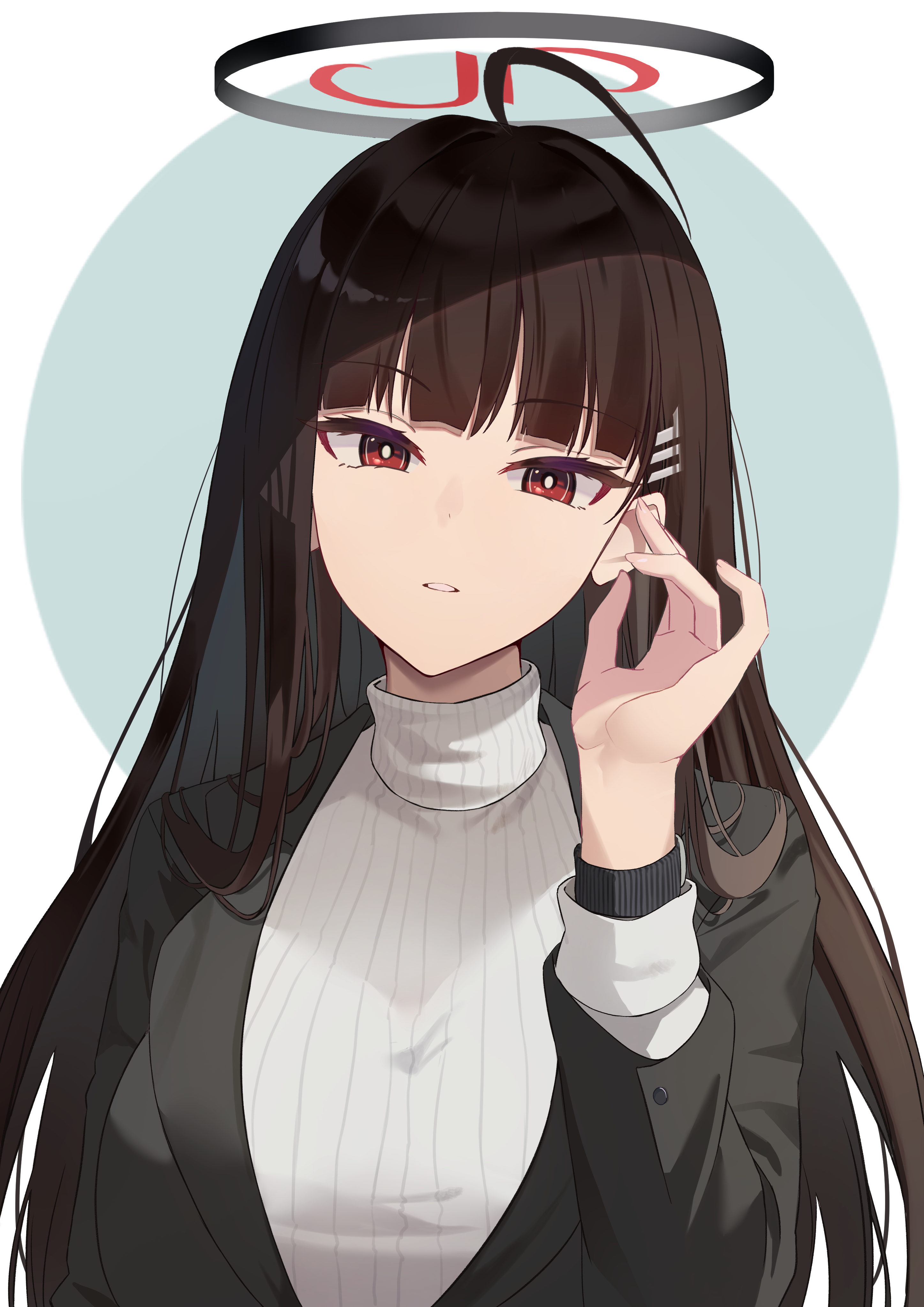 1girl absurdres ahoge black_hair blue_archive breasts bright_pupils formal_clothes hair_ornament hairpin halo highres jbell large_breasts long_hair long_sleeves looking_at_viewer open_mouth red_eyes ribbed_sweater rio_(blue_archive) solo suit sweater turtleneck turtleneck_sweater two-tone_background upper_body white_pupils white_sweater