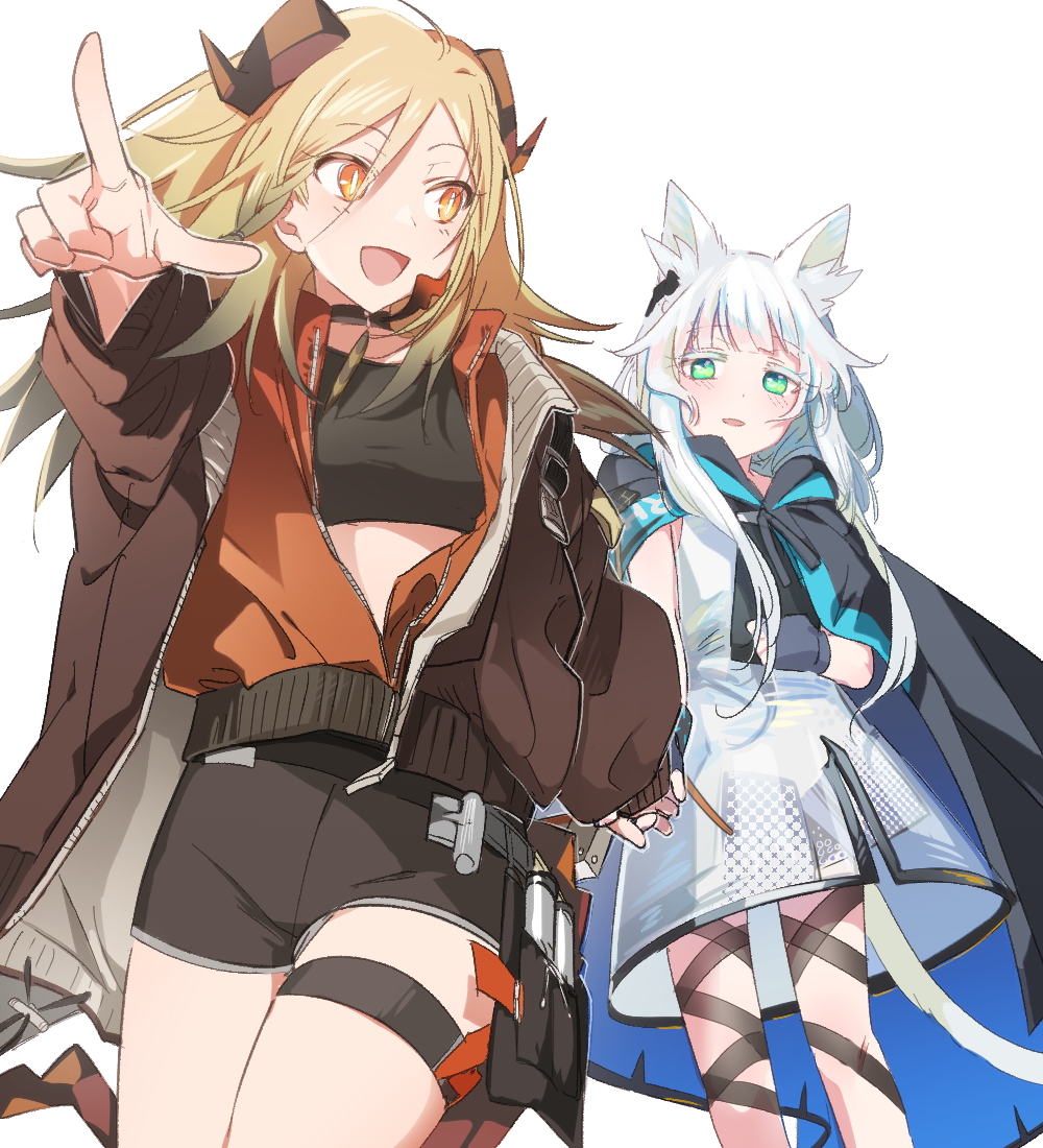 2girls animal_ear_fluff animal_ears arknights black_cape black_gloves black_shirt black_shorts blonde_hair blue_cape blush brown_jacket cape cat_ears cat_girl cat_tail cowboy_shot crop_top demon_horns dress earpiece feather_choker fingerless_gloves gloves hachi32gyi holding_hands horns ifrit_(arknights) ifrit_(lone_trail)_(arknights) jacket long_hair midriff multiple_girls open_clothes open_jacket open_mouth orange_eyes pointing rosmontis_(arknights) shirt shorts sidelocks simple_background tail two-sided_cape two-sided_fabric white_background white_dress white_hair