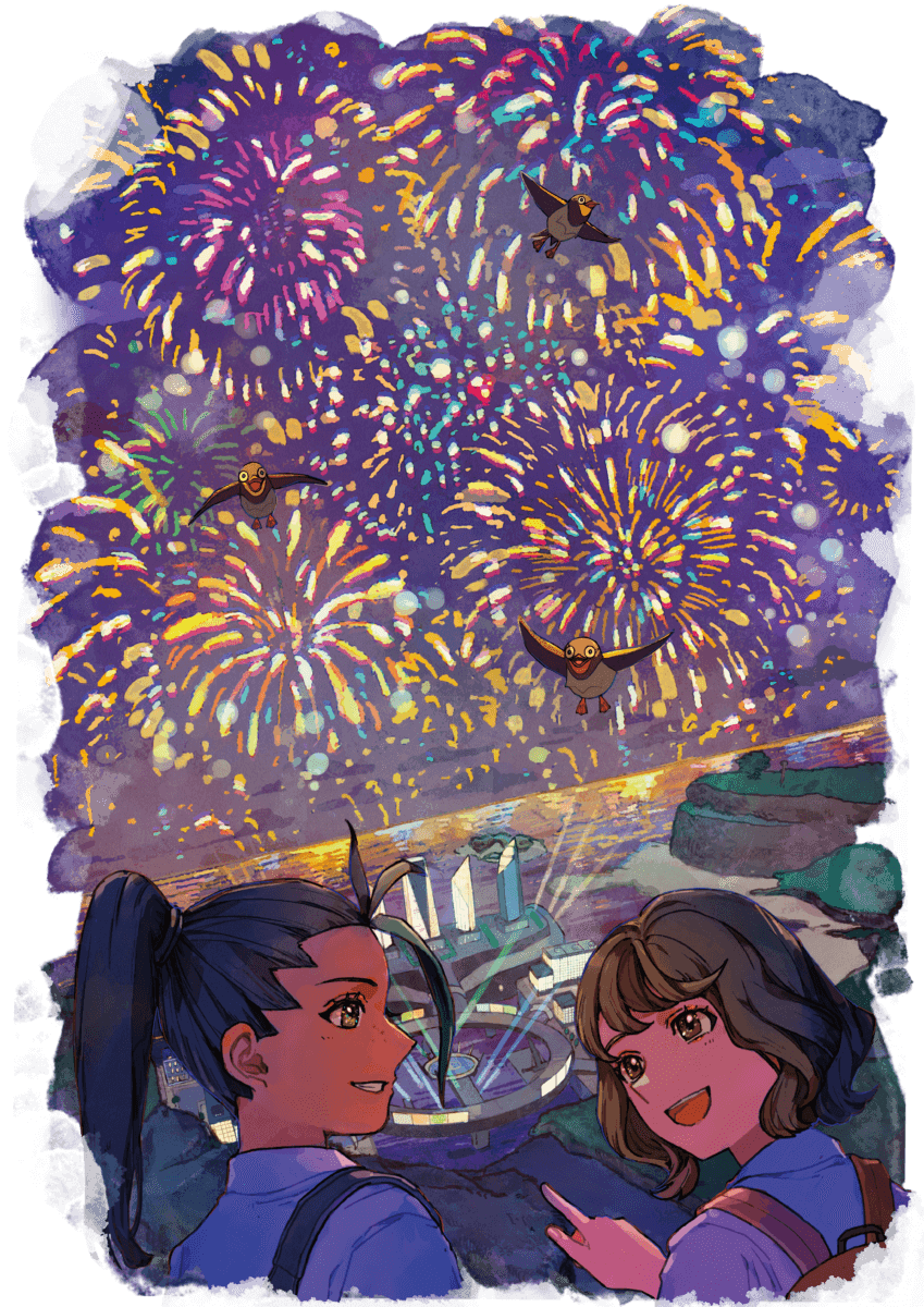 2girls :d anna_(pokemon) artist_request backpack bag bird black_hair brown_eyes brown_hair eye_contact eyelashes fireworks grin highres looking_at_another multicolored_hair multiple_girls nemona_(pokemon) night nintendo open_mouth orange_bag outdoors pointing pokemon pokemon_(creature) pokemon_scarlet_and_violet ponytail school_uniform shirt sky smile teeth two-tone_hair upper_teeth_only wattrel