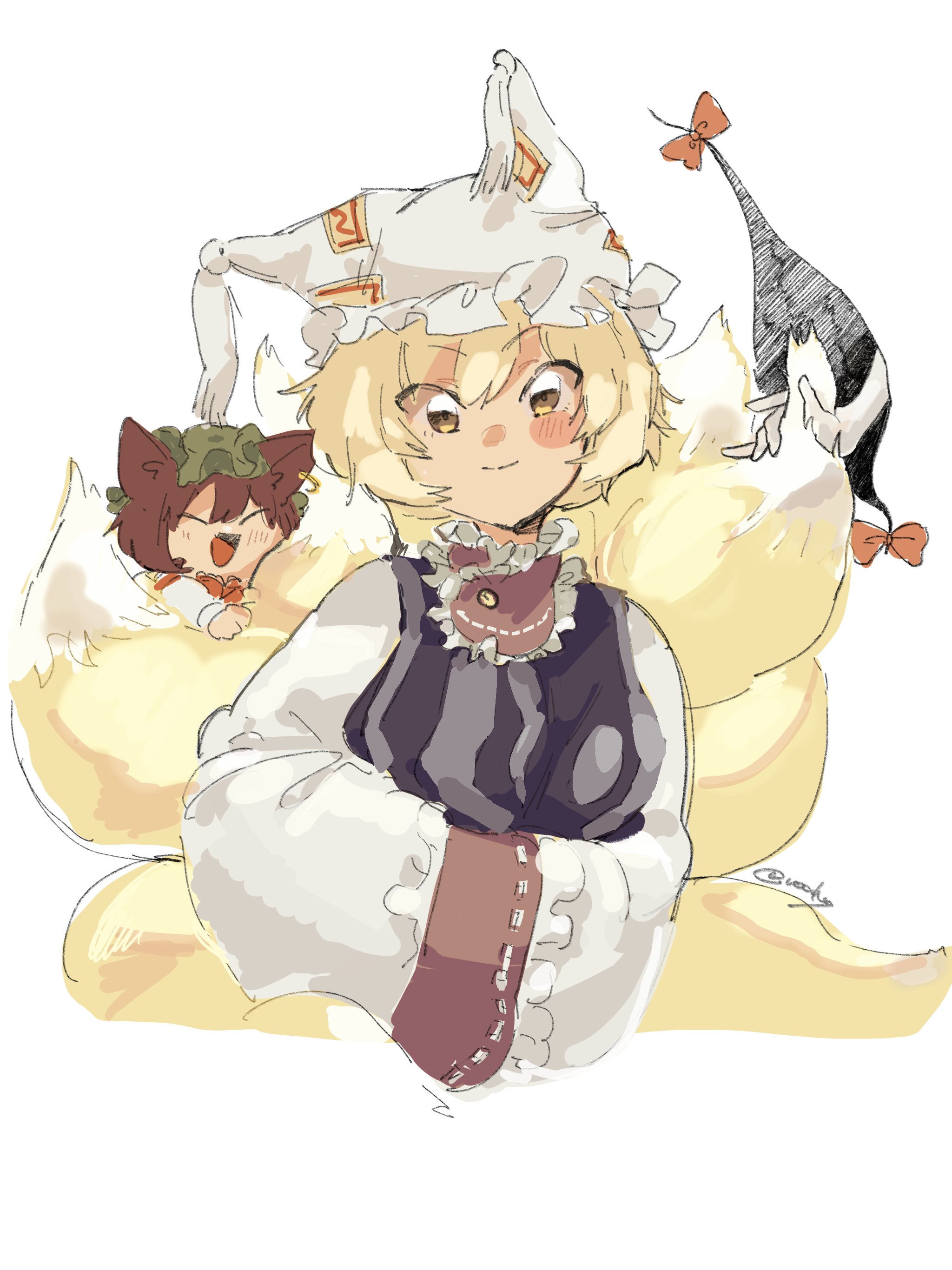 3girls :d absurdres animal_ear_piercing animal_ears arms_up blonde_hair blue_tabard brown_hair cat_ears chen chibi commentary_request cropped_torso earrings fox_ears fox_tail gap_(touhou) green_headwear hands_in_opposite_sleeves happy hat highres jewelry long_sleeves looking_at_viewer mob_cap multiple_girls multiple_tails open_mouth short_hair signature simple_background single_earring smile tabard tail tail_grab tassel touhou upper_body voal white_background white_headwear wide_sleeves yakumo_ran yakumo_yukari yellow_eyes