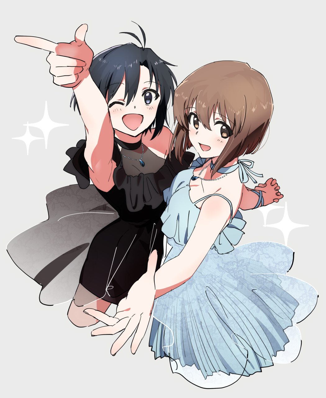 2girls :d antenna_hair black_dress black_hair blue_dress bob_cut brown_eyes brown_hair choker cropped_legs dress eyelashes grey_eyes hagiwara_yukiho highres holding_hands idolmaster idolmaster_(classic) idolmaster_million_live! idolmaster_million_live!_theater_days index_finger_raised interlocked_fingers inverted_bob jewelry kikuchi_makoto looking_at_viewer looking_back messy_hair multiple_girls necklace offering_hand official_alternate_costume open_mouth pointing reaching reaching_towards_viewer ribbon_choker shirop_imas short_hair smile star_(symbol) white_background
