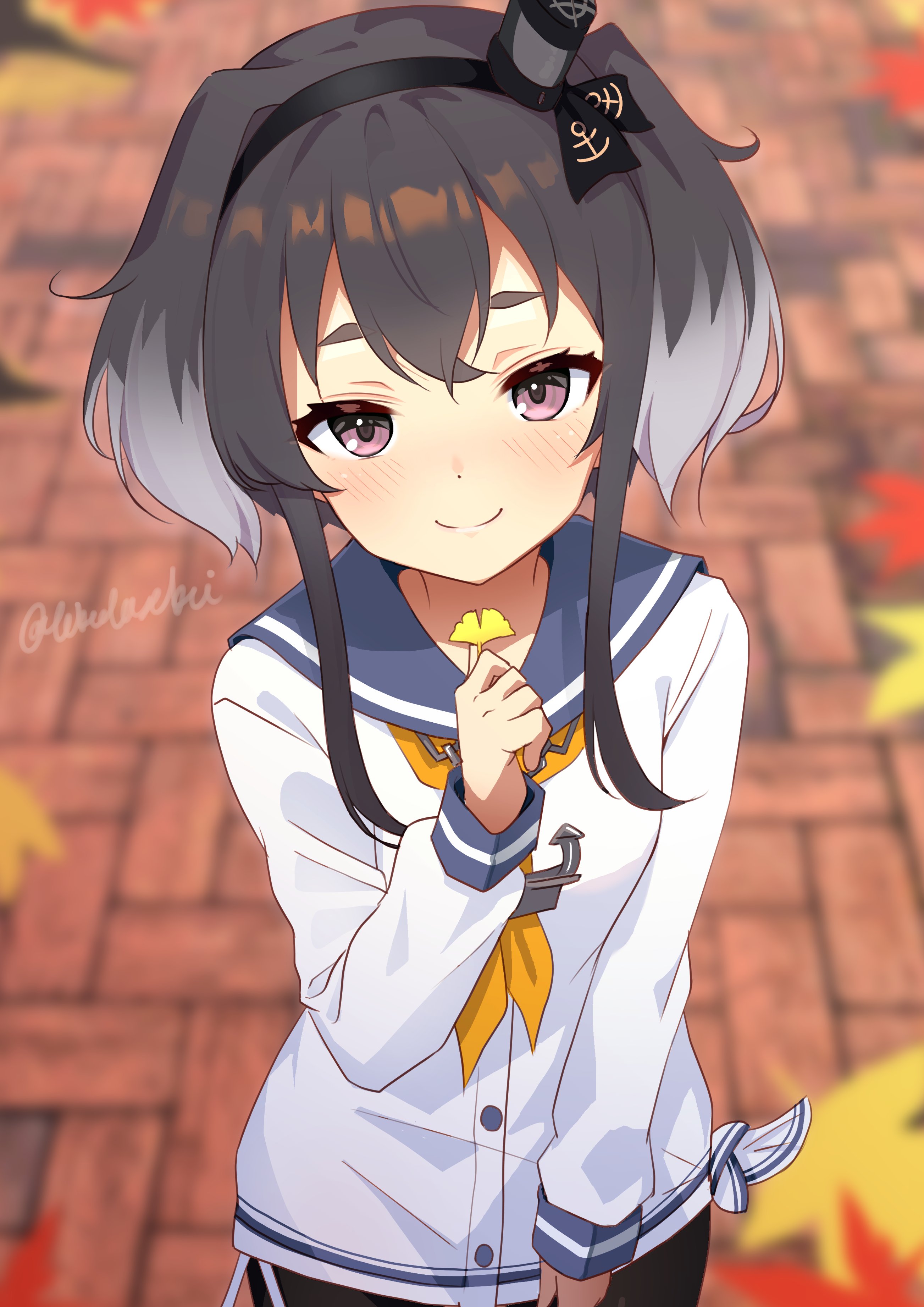 1girl absurdres anchor_necklace autumn_leaves black_hair blue_sailor_collar blurry brick_road brown_eyes depth_of_field dress ginkgo_leaf hat highres jewelry kantai_collection leaf mini_hat neckerchief necklace sailor_collar sailor_dress short_hair short_hair_with_long_locks sidelocks smile smokestack smokestack_hair_ornament solo thick_eyebrows tied_dress toketa-sekai tokitsukaze_(kancolle) twitter_username white_dress yellow_neckerchief