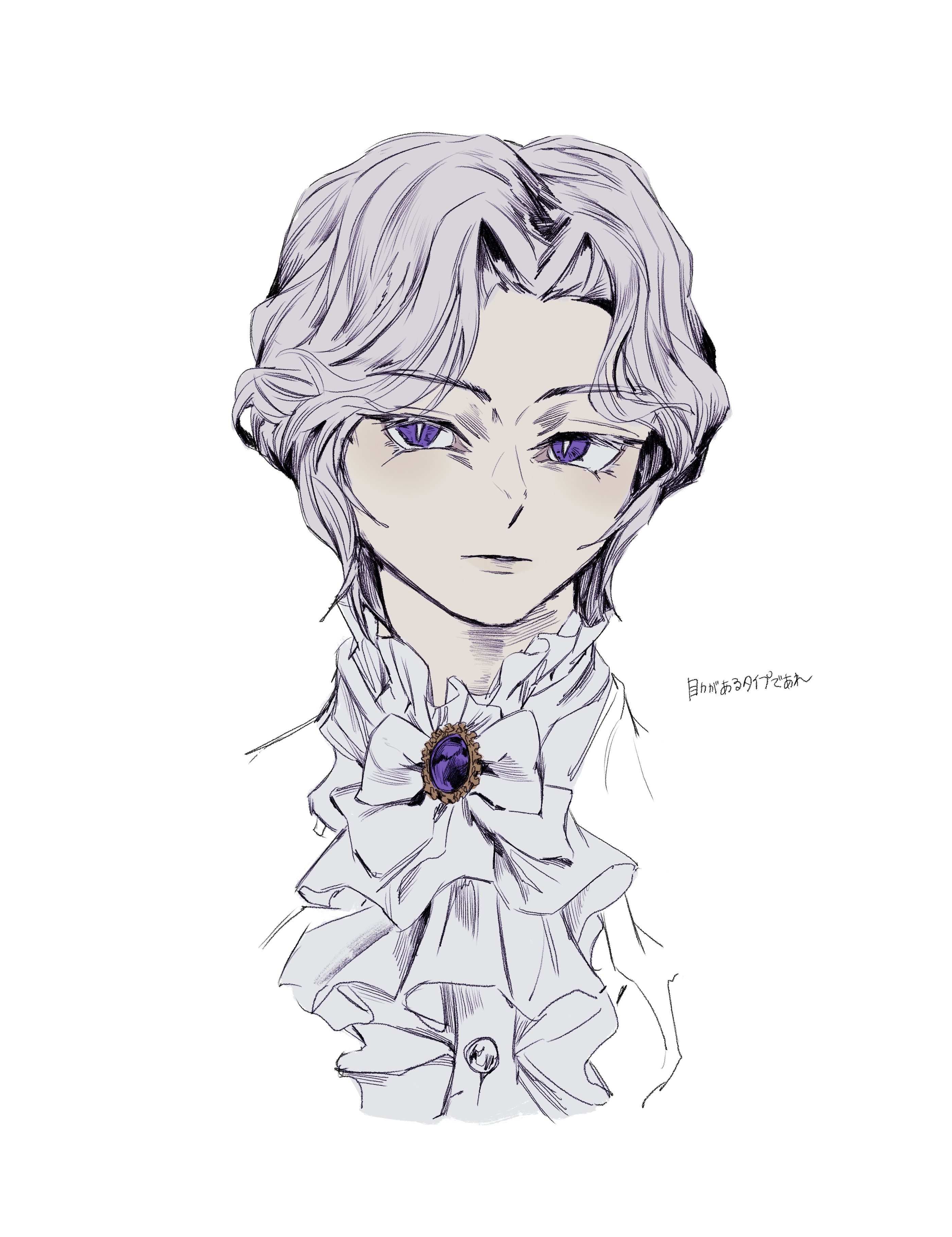 1boy absurdres ascot bow bowtie cropped_shoulders dark_souls_(series) dark_souls_i dark_sun_gwyndolin expressionless gem grey_ascot grey_bow grey_bowtie highres looking_at_viewer male_focus missing_headwear parted_bangs purple_eyes short_hair simple_background solo translation_request trap white_background zunkome