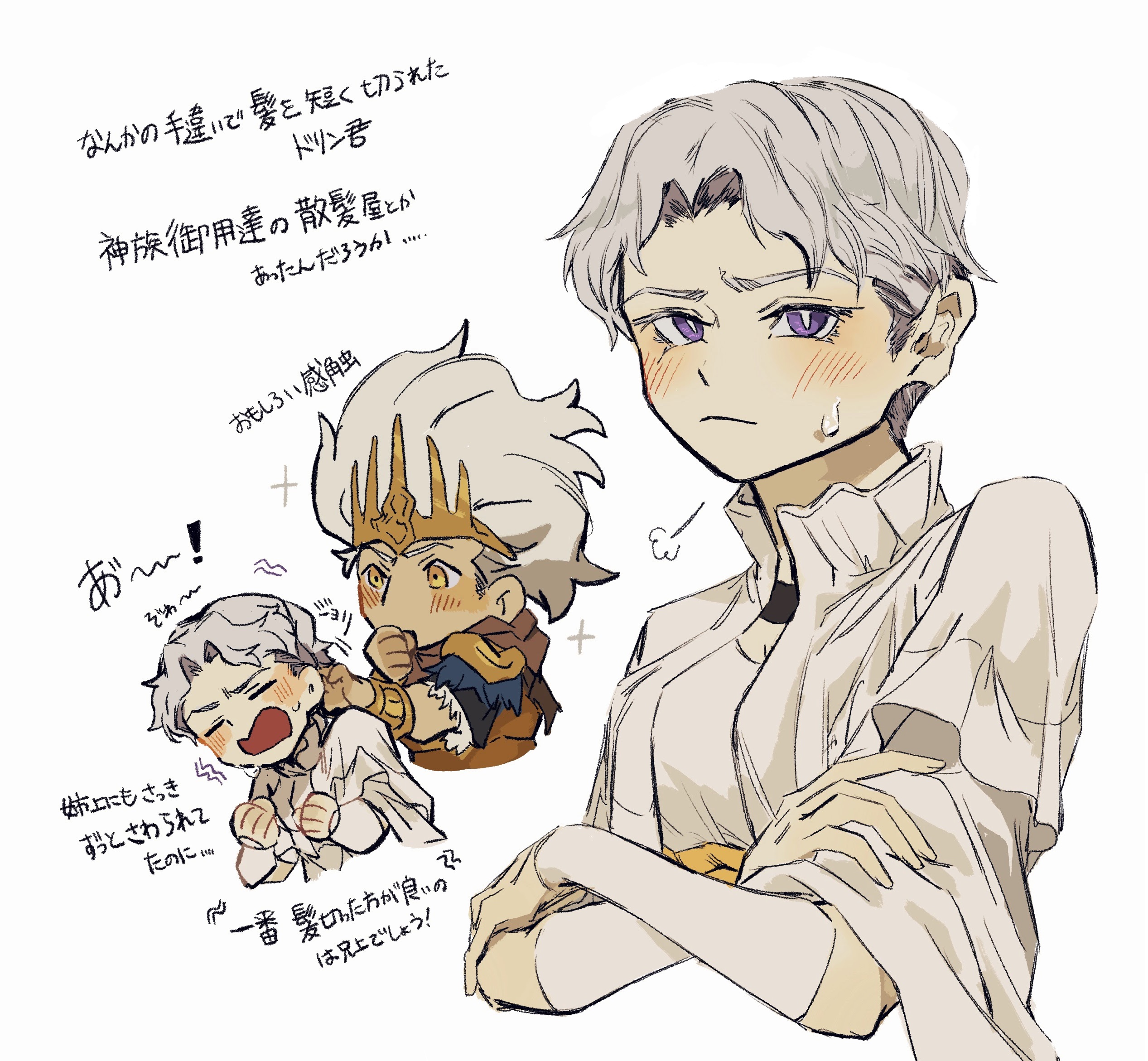 ! 2boys alternate_hairstyle black_choker blush bracelet brothers choker closed_eyes cropped_torso crossed_arms crown d: dark_souls_(series) dark_souls_i dark_souls_iii dark_sun_gwyndolin grey_hair highres jewelry long_hair looking_at_viewer male_focus multiple_boys multiple_views nameless_king missing_headwear open_mouth purple_eyes short_hair short_sleeves siblings simple_background sweatdrop translation_request white_background zunkome