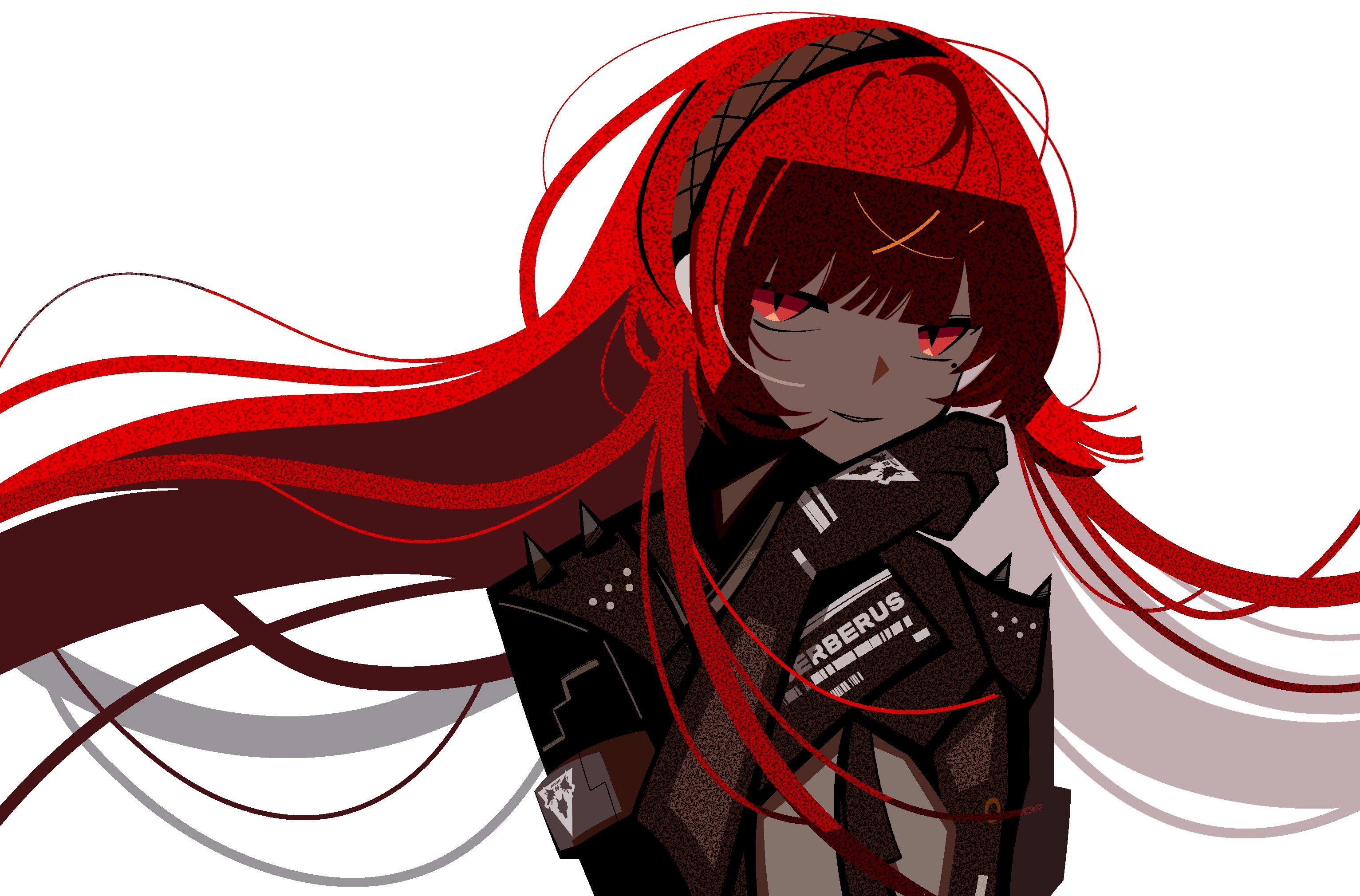 1girl 961_kku black_bodysuit black_hairband bodysuit hairband highres long_hair parted_lips punishing:_gray_raven red_eyes red_hair sidelocks simple_background solo upper_body vera:_rozen_(pgr) vera_(pgr) very_long_hair white_background