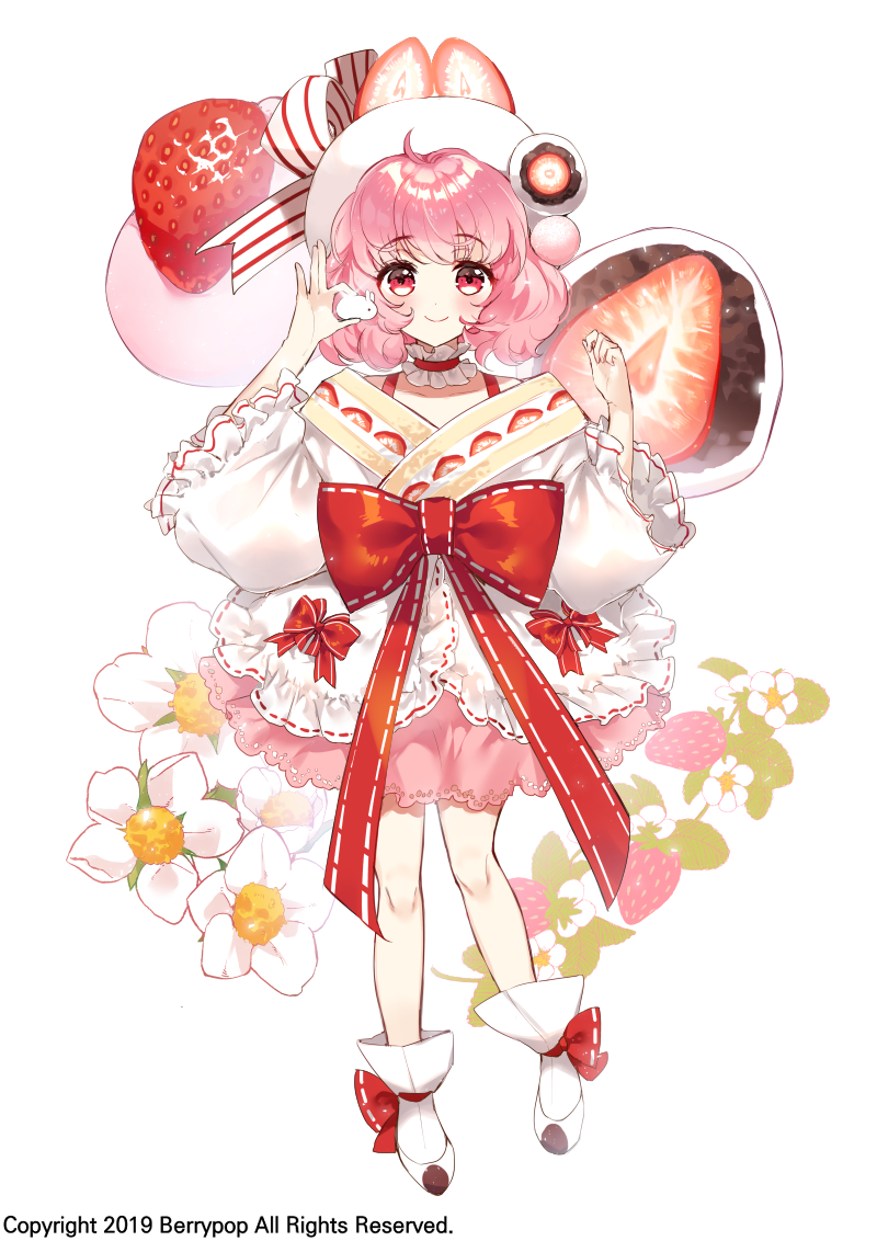 1girl artist_name berrypop blush bow choker closed_mouth collarbone commentary_request copyright_notice daifuku dated dot_nose dress english_text flower food food_print footwear_bow frilled_choker frills fruit fruit_print full_body hands_up hat hat_ribbon holding ichigo_daifuku knees legs long_sleeves looking_at_viewer medium_hair original pink_eyes pink_hair pink_skirt raised_eyebrows red_bow red_choker ribbon simple_background skirt smile solo strawberry strawberry_print strawberry_slice striped_ribbon three-quarter_sleeves wagashi wavy_hair white_background white_choker white_dress white_flower white_footwear white_hat white_ribbon wide_sleeves