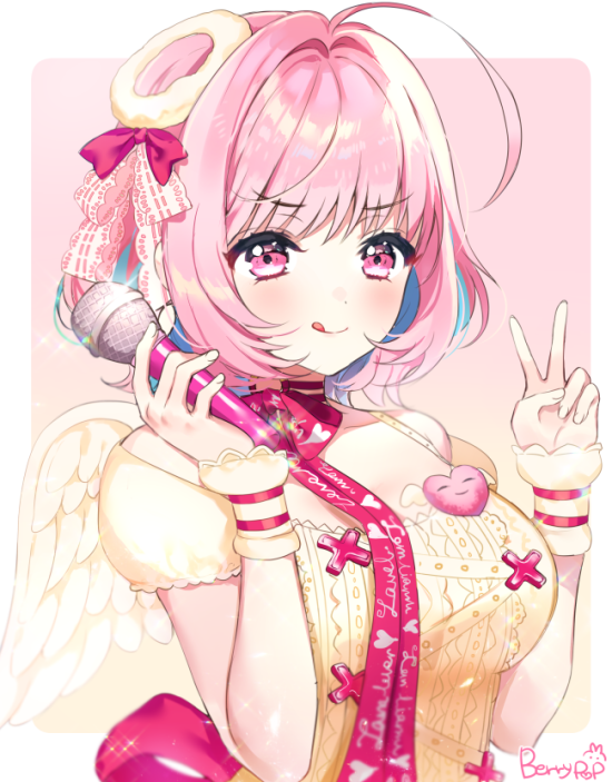 1girl :p ahoge angel_wings aqua_hair artist_name berrypop blush bob_cut bow breasts closed_mouth collarbone colored_inner_hair commentary dot_nose dress fake_halo fingernails gradient_background hair_bow hair_intakes hair_ribbon halo heart heart-shaped_ornament heart_print holding holding_microphone idolmaster idolmaster_cinderella_girls idolmaster_cinderella_girls_starlight_stage large_breasts looking_at_viewer medium_hair microphone multicolored_hair pink_background pink_eyes pink_hair pink_ribbon red_bow ribbon short_sleeves signature smile solo tongue tongue_out two-tone_hair v white_ribbon wings wrist_cuffs yellow_dress yellow_halo yellow_wings yellow_wrist_cuffs yumemi_riamu
