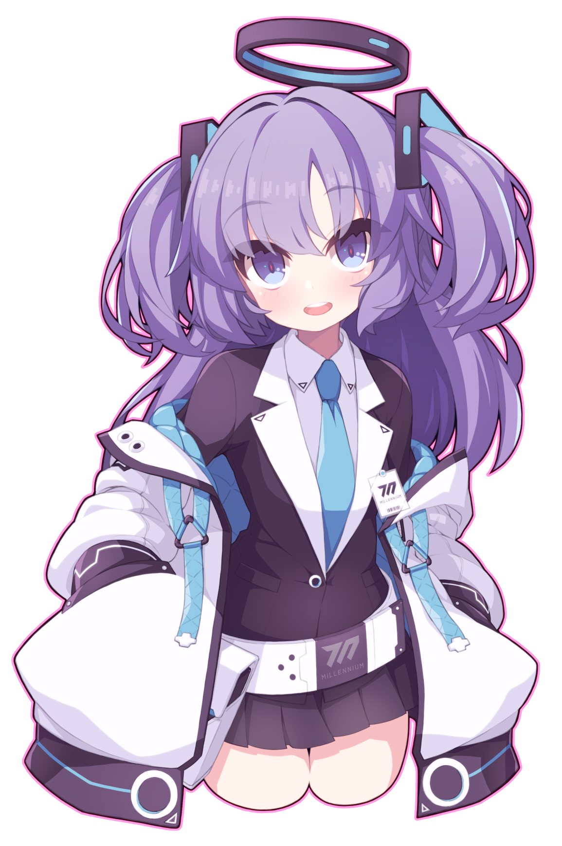 1girl :d black_jacket black_skirt blue_archive blue_necktie blush breasts collared_shirt cropped_legs halo hand_up hands_in_pockets highres jacket long_sleeves looking_at_viewer necktie off_shoulder open_mouth outline parted_bangs pink_outline pleated_skirt puffy_long_sleeves puffy_sleeves purple_eyes purple_hair rikumaru shirt simple_background skirt sleeves_past_wrists small_breasts smile solo teeth two_side_up upper_teeth_only white_background white_shirt yuuka_(blue_archive)