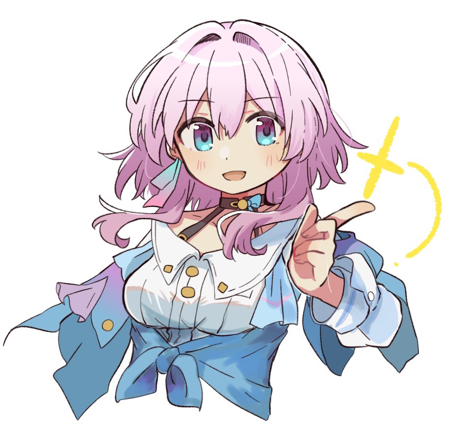 1girl :d black_choker blue_eyes blue_shirt blush buttons choker collared_shirt cropped_arms cropped_torso dot_nose earrings hair_intakes hara_(nanohara) honkai:_star_rail honkai_(series) jewelry layered_sleeves long_sleeves looking_at_viewer march_7th_(honkai:_star_rail) march_7th_(preservation)_(honkai:_star_rail) medium_hair open_mouth pink_hair pointing pointing_at_viewer ribbon_earrings shirt shirt_under_shirt simple_background single_earring sleeve_cuffs smile solo sparkle tied_shirt upper_body white_background white_shirt