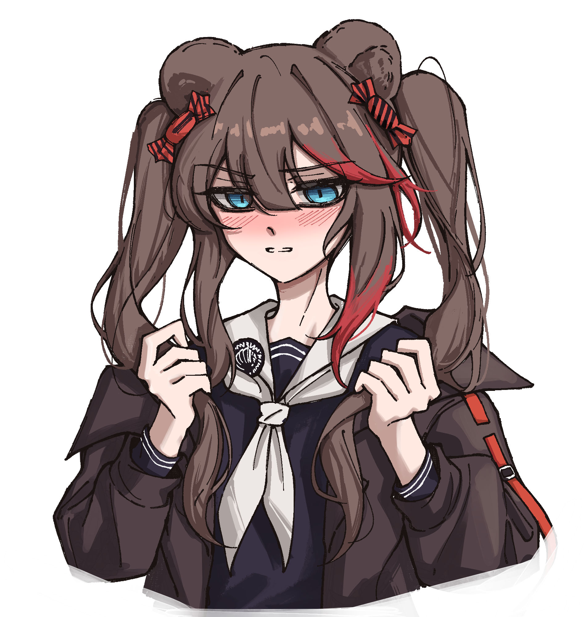 1girl alternate_hairstyle arknights blue_dress blue_eyes blush brown_hair brown_jacket candy_hair_ornament cosplay dress food-themed_hair_ornament gummy_(arknights) gummy_(arknights)_(cosplay) hair_between_eyes hair_ornament hands_up highres holding holding_own_hair jacket long_hair looking_at_viewer multicolored_hair neckerchief open_clothes open_jacket petra_(jgc845601) red_hair sailor_dress simple_background solo streaked_hair twintails upper_body white_background white_neckerchief zima_(arknights)