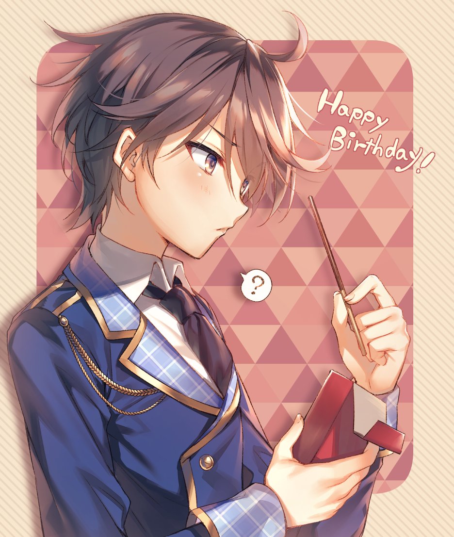 1boy ? black_necktie blue_jacket blush brown_hair collared_shirt excalibur_academy_school_uniform food happy_birthday holding holding_food holding_pocky jacket leonis_death_magnus long_sleeves male_focus necktie official_art outside_border plaid_clothes plaid_jacket pocky purple_eyes seiken_gakuin_no_maken_tsukai shirt short_hair white_shirt