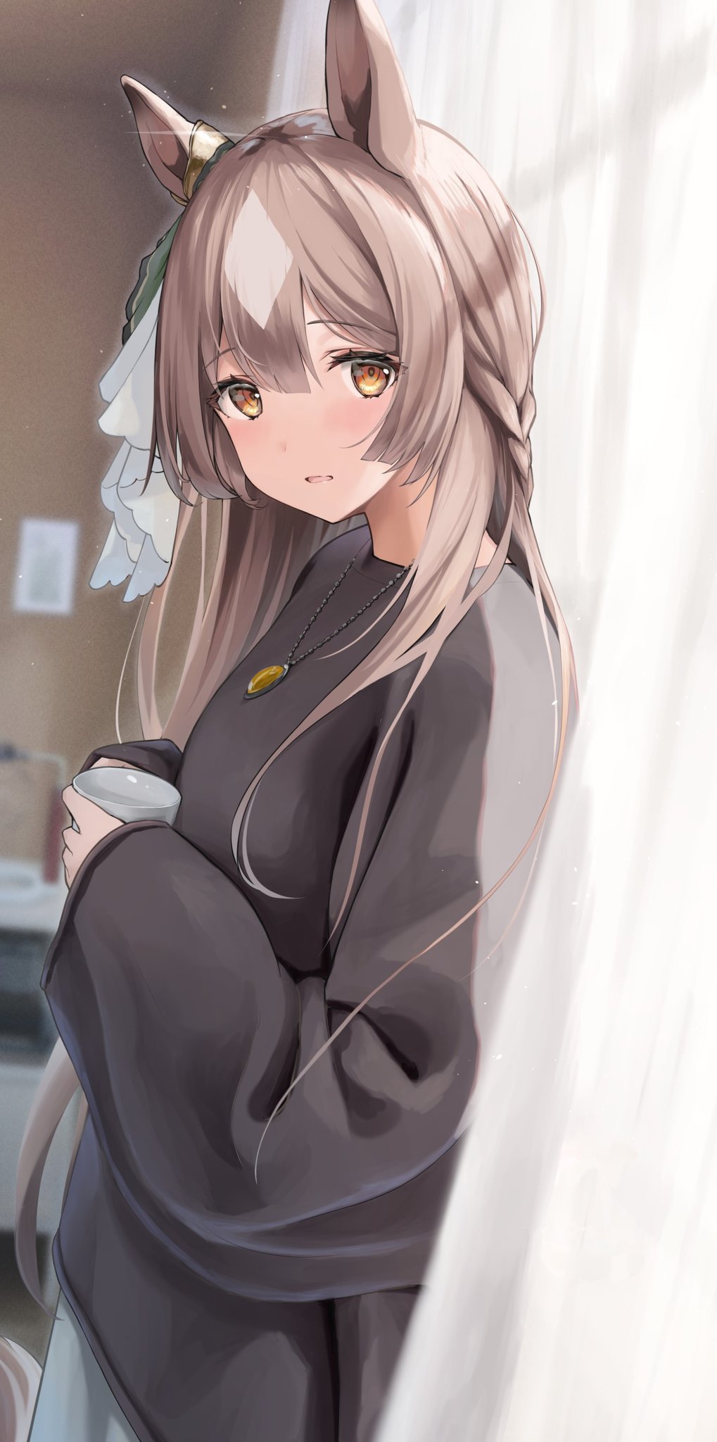1girl alternate_costume animal_ears black_shirt blurry blurry_background braid brown_hair butterwabito commentary cup curtains diamond_(shape) double-parted_bangs ear_ornament hair_between_eyes half_up_braid highres holding holding_cup horse_ears horse_girl indoors jewelry long_hair long_sleeves looking_at_viewer multicolored_hair necklace open_mouth orange_eyes oversized_clothes oversized_shirt parted_lips puffy_long_sleeves puffy_sleeves satono_diamond_(umamusume) shirt side_braid solo streaked_hair two-tone_hair umamusume upper_body white_hair