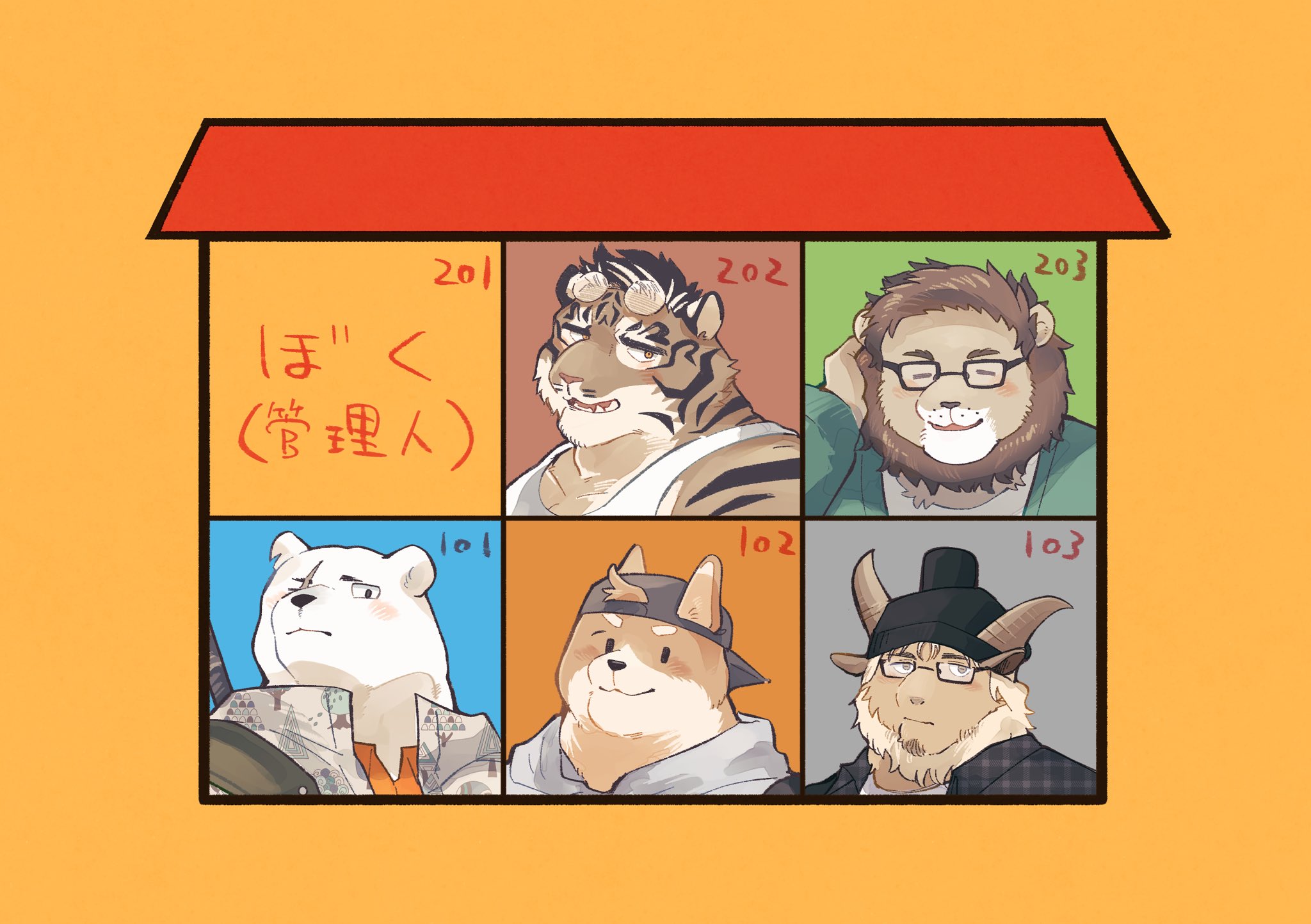 5boys animal_ears backwards_hat bara bear_boy bear_ears beard black_hair black_headwear brown_fur brown_hair close-up closed_mouth dog_boy dog_ears facial_hair furry furry_male glasses goat_boy goat_ears goat_horns hand_on_own_head hat highres horns jiguberuto_(sawch_cls) lion_boy lion_ears lion_mane male_focus multiple_boys nakayama_taketaka_(sawch_cls) open_clothes open_mouth open_shirt orange_fur original osukemoapartment(sawch_cls) sawch_cls scar scar_across_eye scar_on_face shiotani_hisashi_(sawch_cls) shirt short_hair sotoma_kazuchika_(sawch_cls) tiger_boy tiger_ears tiger_stripes two-tone_fur undershirt white_fur white_hair yakushiji_taku_(sawch_cls)