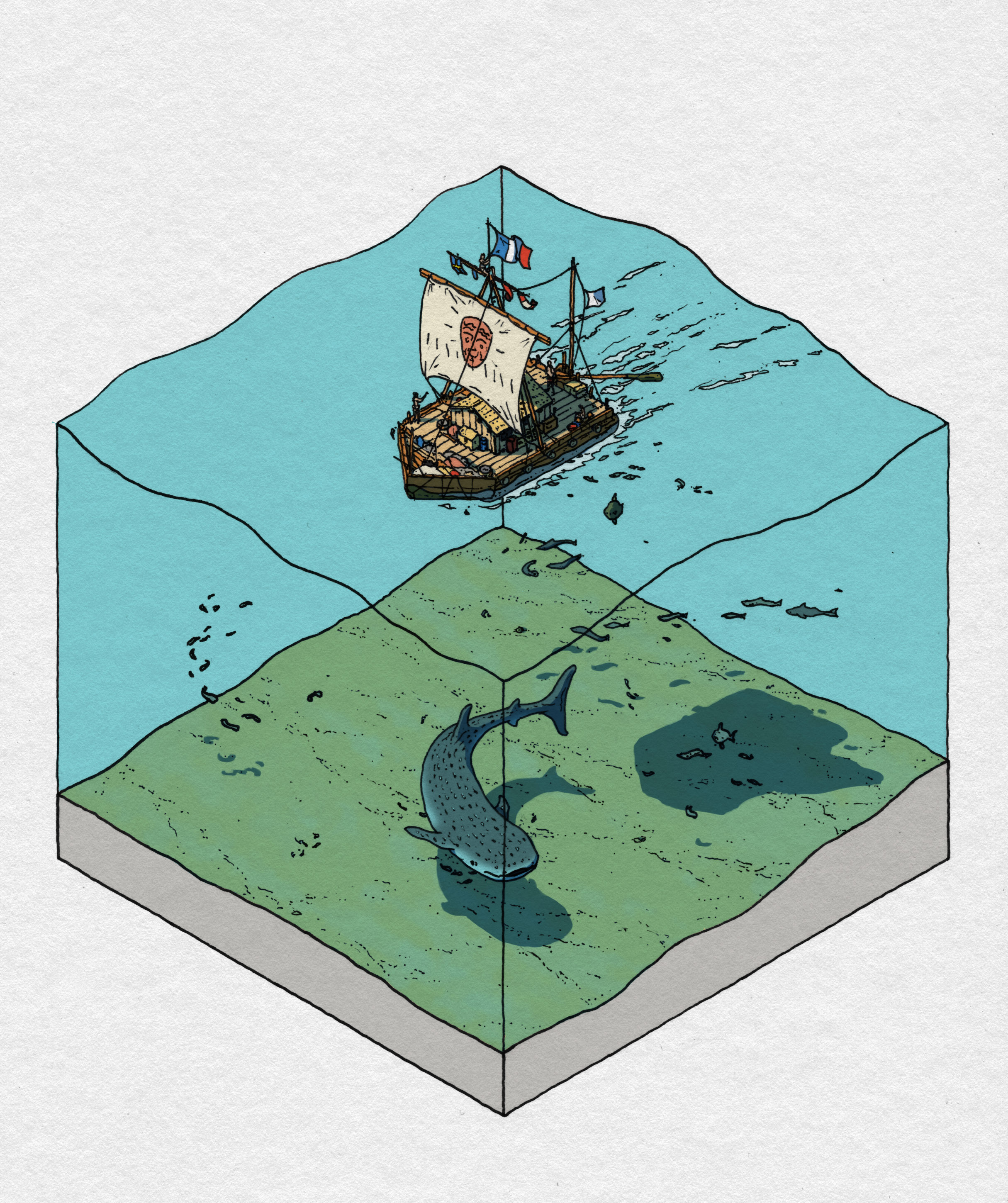 absurdres animal commentary cross-section english_commentary fish french_flag highres historical_event ocean ocean_sunfish odpomery original raft sail sand seafloor shark simple_background vehicle_focus water white_background