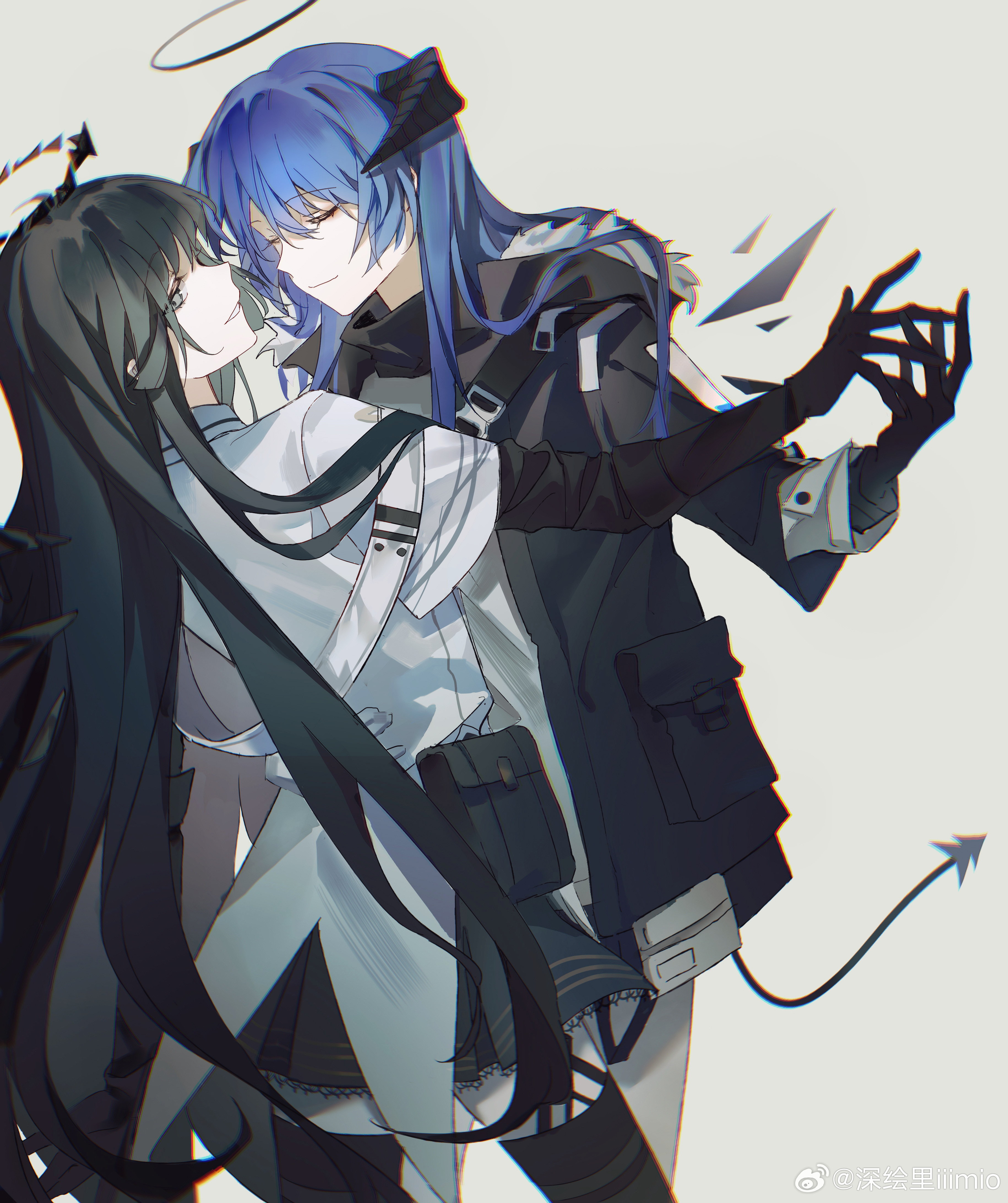 2girls absurdres arknights artist_name asymmetrical_gloves bandana bandana_around_neck bare_legs belt belt_buckle black_bandana black_belt black_eyes black_garter_straps black_gloves black_hair black_halo black_jacket black_skirt black_sleeves black_thighhighs black_wings blue_hair blunt_bangs blurry blurry_edges broken_halo buckle buttoned_cuffs buttons chinese_commentary chinese_text chromatic_aberration closed_eyes closed_mouth collared_jacket commentary_request cowboy_shot dancing dark_halo demon_tail detached_wings energy_wings eyelashes facing_another fallen_angel from_side fur-trimmed_hood fur_trim garter_straps gloves hair_between_eyes halo hand_on_another's_back hand_up hands_up highres hime_cut hood hood_down hooded_jacket hug jacket layered_sleeves light_smile long_hair long_sleeves looking_at_viewer miniskirt mismatched_gloves mostima_(arknights) multiple_girls open_clothes open_jacket outstretched_arm outstretched_hand pale_skin pleated_skirt pocket pouch shade shenhuili shirt short-sleeved_jacket short_over_long_sleeves short_sleeves sidelocks sideways_glance simple_background skirt sleeve_cuffs smile snap-fit_buckle standing tail teeth thighhighs very_long_hair virtuosa_(arknights) waltz_(dance) watermark weibo_watermark white_background white_belt white_gloves white_jacket white_shirt wide_sleeves wings yuri zettai_ryouiki