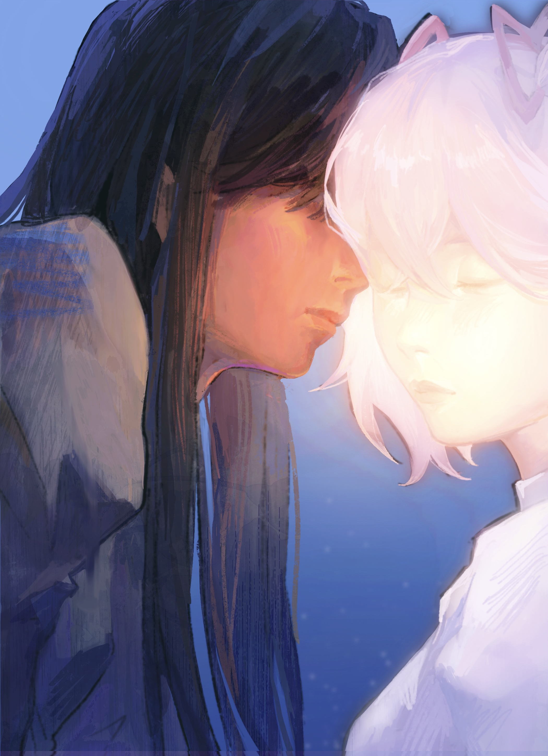 2girls absurdres akemi_homura black_hair blue_background chinese_commentary closed_eyes commentary_request covered_eyes expressionless from_side glowing hair_over_eyes hair_ribbon heads_together highres juliet_sleeves kaname_madoka long_hair long_sleeves mahou_shoujo_madoka_magica mahou_shoujo_madoka_magica_(anime) multiple_girls pink_hair portrait puffy_sleeves ribbon shao_ziye short_hair straight_hair