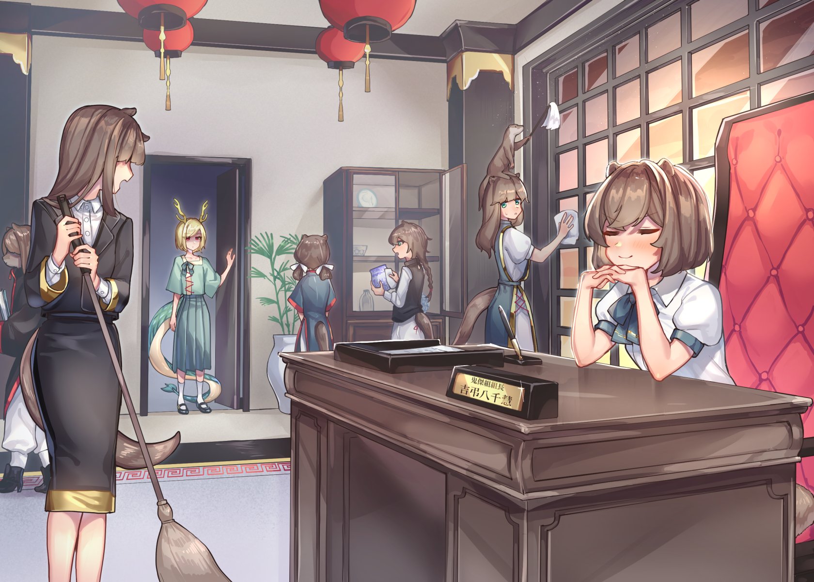 6+girls antlers blue_shirt completely_unamused dragon_girl dragon_horns dragon_tail highres horns kicchou_yachie multiple_girls otter otter_spirit_(touhou) shirt tail touhou unamused wankosoba_(wanwan_soba) yellow_horns